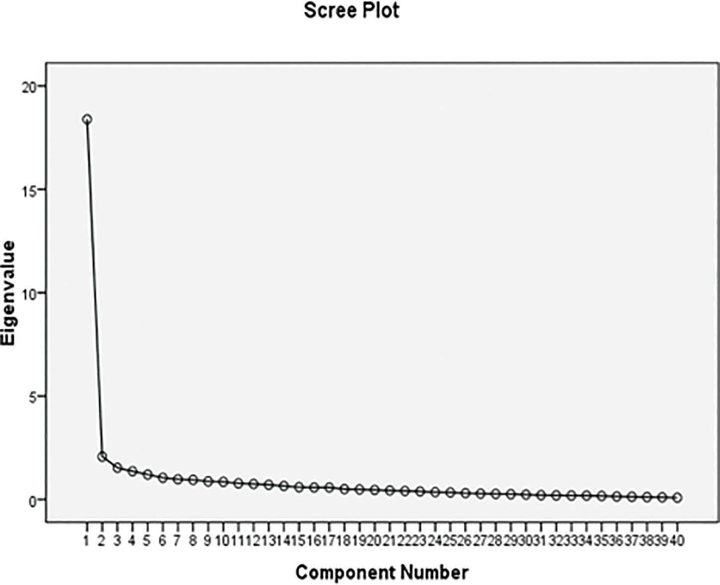 Exploratory factor analysis was performed on 40 statements, by which the KMO value of 0.92 was calculated. Also, BT was significant with 7.499 at the 0.0001 level, which justified implementation of the factor analysis based on the correlation matrix obtained in the study sample.