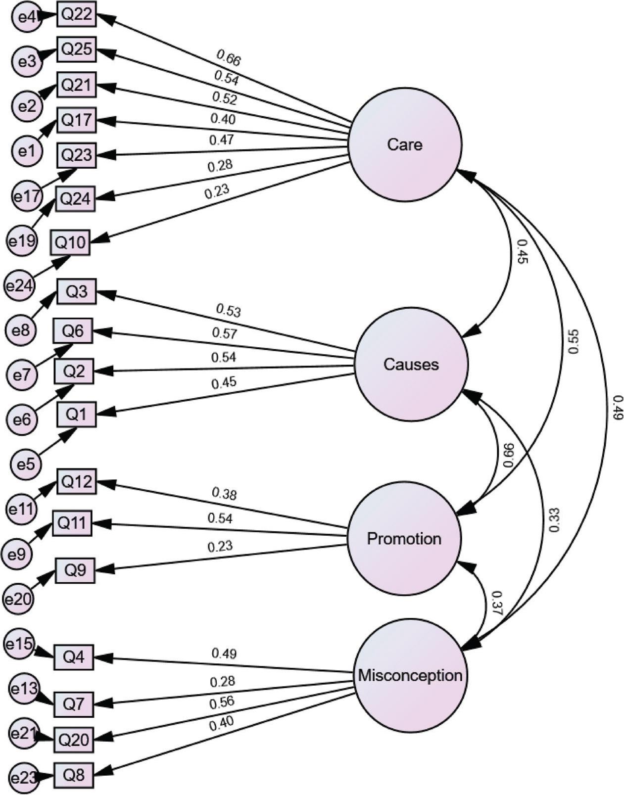 The four-factor model of this study did not align perfectly with the factor model of the original version of the DKAS.22 Factors of the original version included “cause and characteristics,” “communication and behaviors,” “care considerations,” and “risks and health promotion.”22 In this study, four factors were labeled “care considerations,” “cause and characteristics of dementia,” “health promotion,” and “misconceptions about dementia” based on careful consideration of the original version of the DKAS,22 the Singaporean version,21 and a literature survey. The factors of the Singaporean version (three-factor model) included “misconceptions about dementia,” “caregiving considerations toward dementia,” and “dementia symptoms.”21