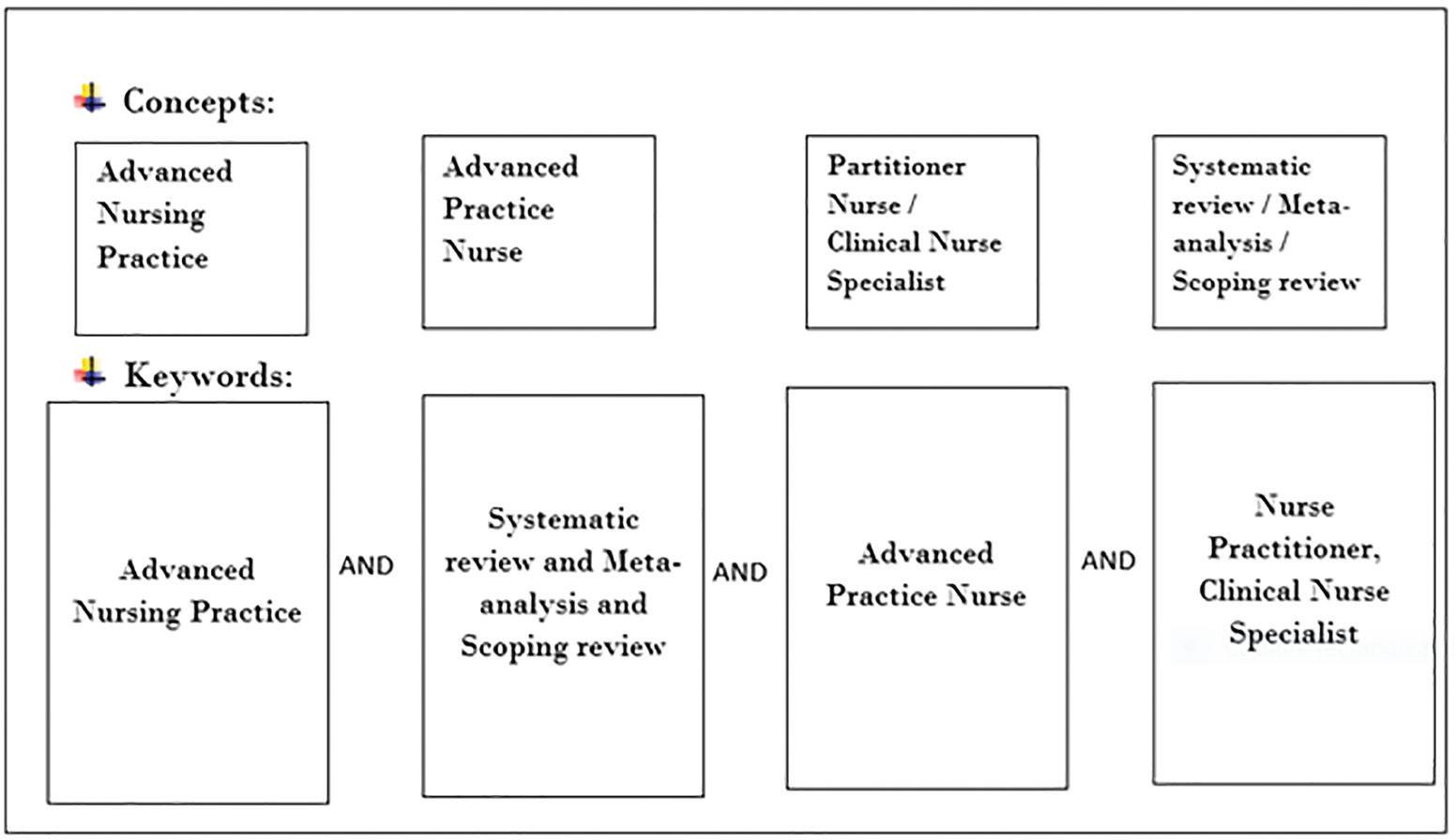 | 4. Advanced practice nursing roles in Arab countries in the Eastern Mediterranean region: a scoping review protocol | Almukhaini et al.15 | 2021 | Scoping review | Explore and summarize evidence related to advanced practice nursing roles in Arab countries in the Eastern Mediterranean region | APN definition, characteristics, outcomes, and the entry-level of education, globally and in the Eastern Mediterranean region |