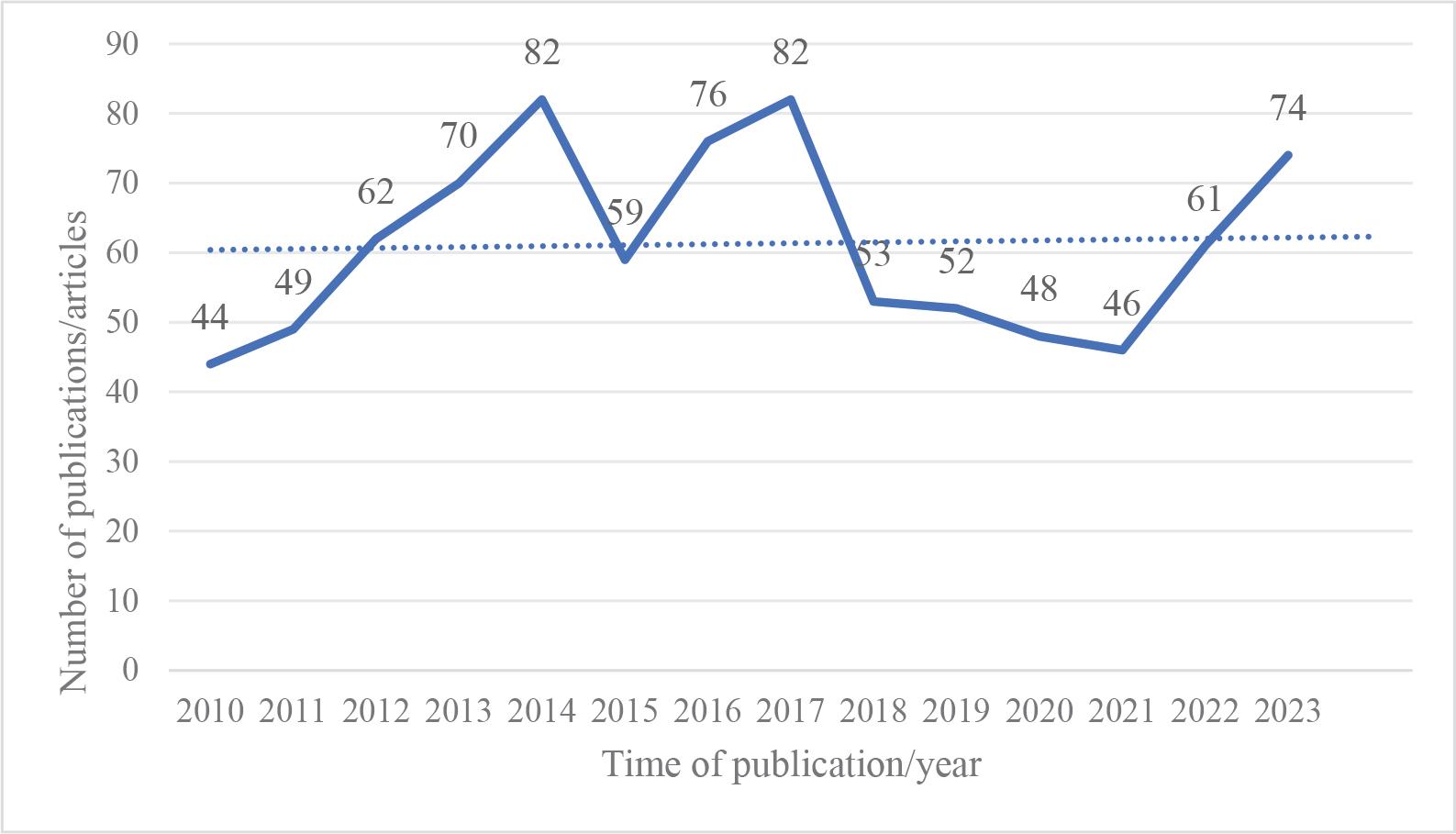 The publication volume over various periods reflects the popularity and developmental trends within a specific research domain. Following the defined retrieval strategy and screening process, 860 articles related to the application of cognitive reserve in the rehabilitation of cerebral stroke cognitive impairment were collected in this paper. Excluding 2 papers published in January 2024, 858 papers were retained. As shown in Figure 1, the publication frequency in this domain has been relatively unstable, and it can be seen that stroke prevention and treatment represent a global challenge. However, from 2021 to 2023, an upward trend in publications suggests growing research interest in this area.