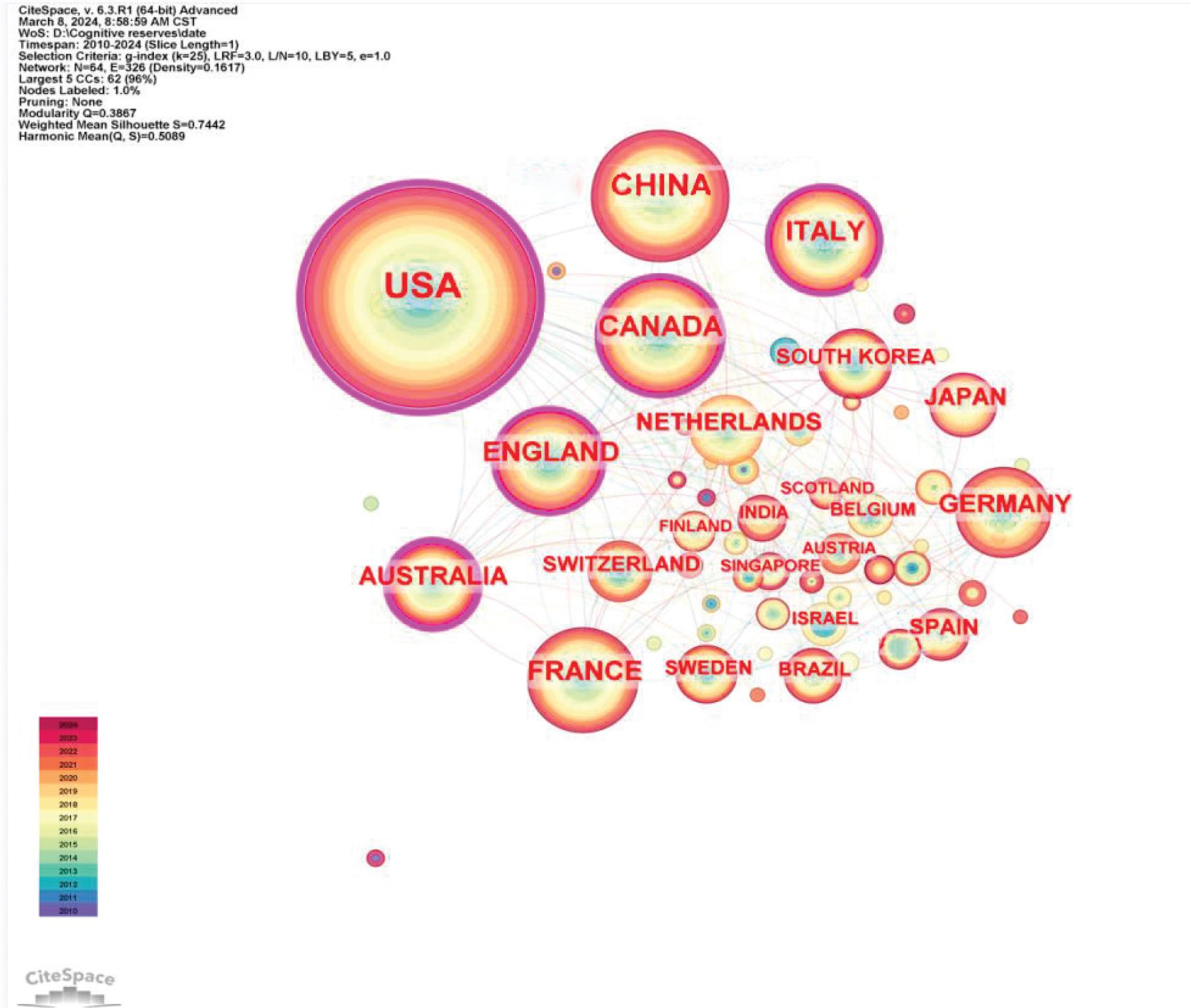 Analysis using CiteSpace 6.3.R1(64-bit) software revealed that the 5 leading countries by publication volume are the United States, China, Canada, Italy, and the United Kingdom. These countries are foremost in research output in the field of applied research on cognitive reserve and stroke cognitive impairment.