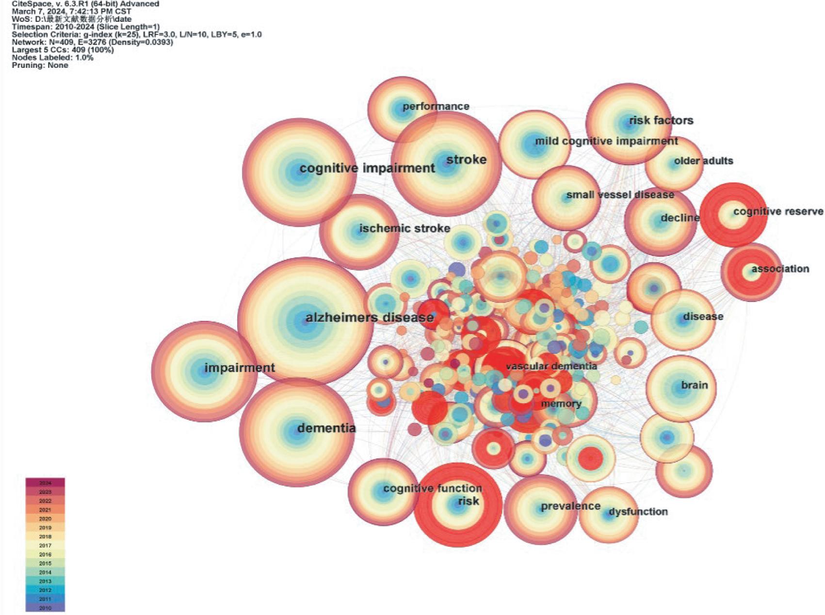 Keyword co-occurrence analysis, excluding terms akin to the search query, identified primary keywords including dementia, cognitive impact, and risk factors. Keyword cluster analysis grouped these keywords into 6 main clusters: vascular dementia, oxidative stress risk factors, brain paralysis, executive function, cognitive reserve, and Montreal cognitive assessment. The predominant research focus in this field is vascular dementia, which aligns with the hot analysis results of highly cited literature. Keyword burst analysis indicated that reserve, education, and cognitive recovery aligned with the directions of the last 2 clusters in keyword cluster analysis. Education, cognitive stimulation, and cognitive assessment have emerged as new research hotspots. The author’s discussion, informed by visualizing and analyzing the literature, enhances the understanding of highly cited keywords and emerging research hotspots.