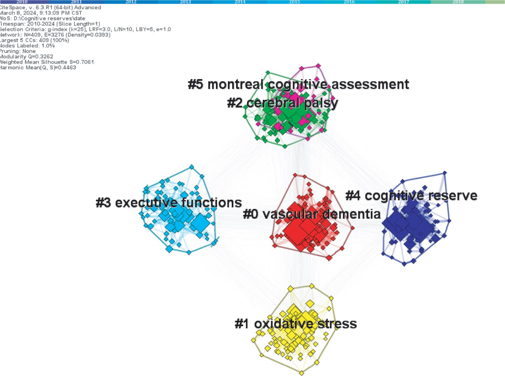 Note: In the keyword cluster network diagram, larger nodes indicate a greater number of published articles, red, yellow, green, light blue, dark blue, red represent 6 different clusters (divided into #0 vascular dementia; #1 Oxidative stress; #2 Cerebral paralysis; #3 Execution ability; #4 Cognitive reserve; and #5 Montreal cognitive assessment), and thicker lines denote a higher correlation between keywords. Q = 0.3262, (>0.3), S = 0.7061 (>0.7), and clustering is efficient and convincing.