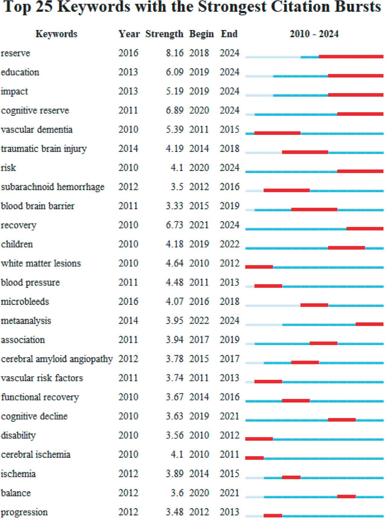 The application of cognitive reserve in cognitive impairment in stroke: keyword outbreak distribution map (Web of Sciences Database).