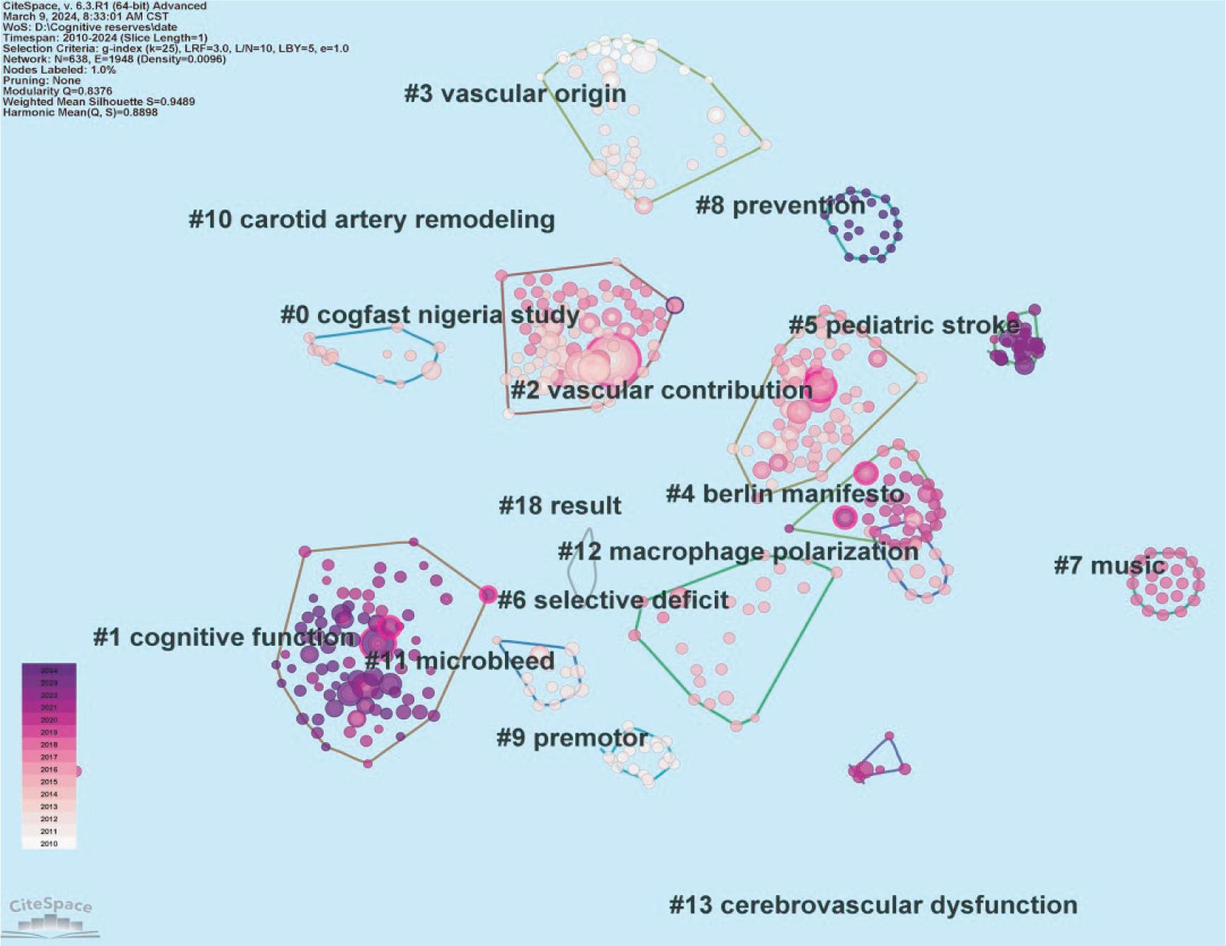 Note: In the literature co-citation cluster graph, the color of the cluster represents the year in which the co-citation relationship first appeared in the cluster, the size of the node represents the citation frequency of the literature, and the color of the connection represents the time of the first citation. The clusters in the figure are as follows: #0 CogFAST Nigeria study, #1 cognitive function, #2 vascular contribution, #3 vascular origin #4 berlin manifesto, #5 pediatric stroke, #6 selective deficit, #7 music, #8 prevention, #9 premotor, # 10 carotid artery remodeling, #11 microbleed, #12 carotid artery resection polarization, #13 cerebrovascular dysfunction, #18 result, and cerebrovascular dysfunction. In the recent 5 years (2020–2024), literature clustering in the common citation map of research hotspots is as follows: #1 cognitive function, #5 pediatric stroke, #8 prevention, #11 microbleed, and #12 macrophage polarization. Q = 0.8376 (>0.3), S = 0.9489 (>0.7, close to 1), and clustering was efficient and feasible.