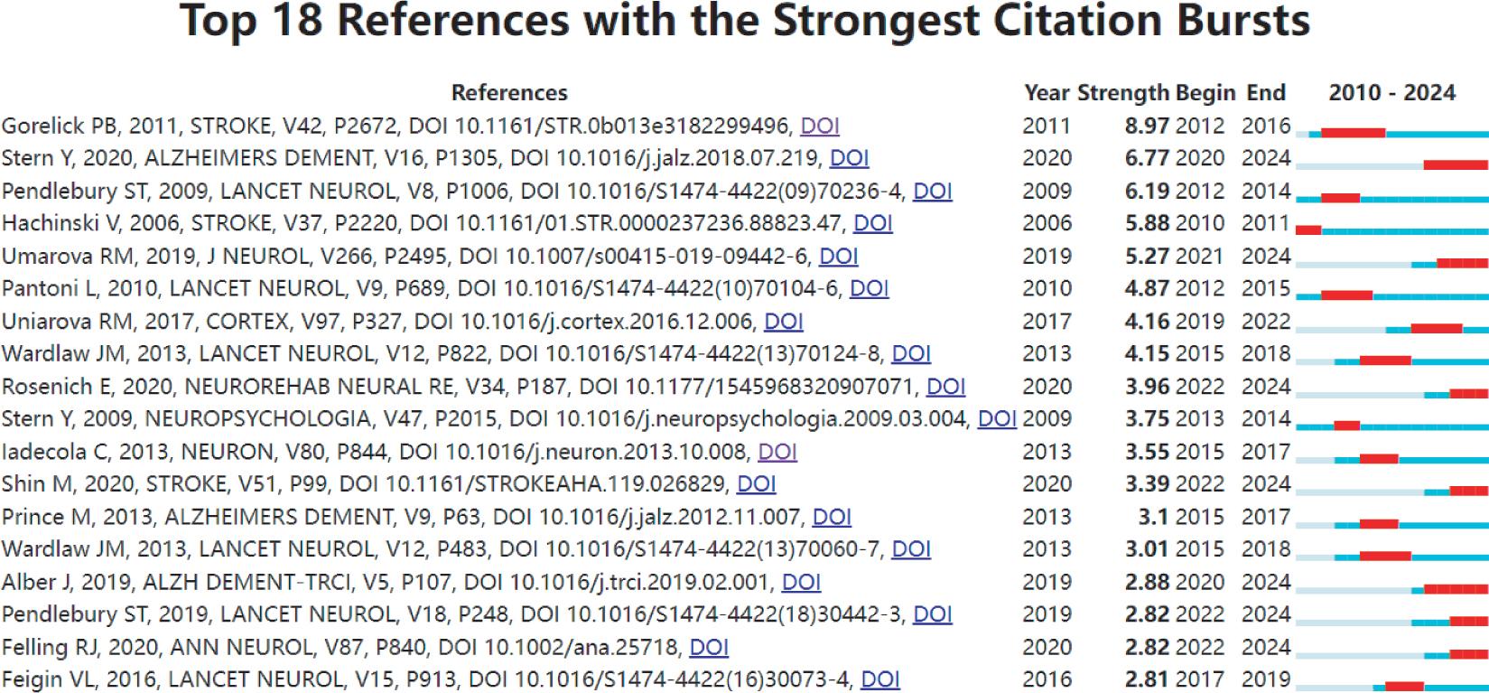 Additional highly cited literature includes clinical studies focusing on the pathogenesis and clinical characteristics of vascular cognitive impairment, along with the relationship between the prevalence and incidence of cognitive impairment in relation to vascular disease onset. Through this research, criteria for the diagnosis of related diseases have been established.17–19