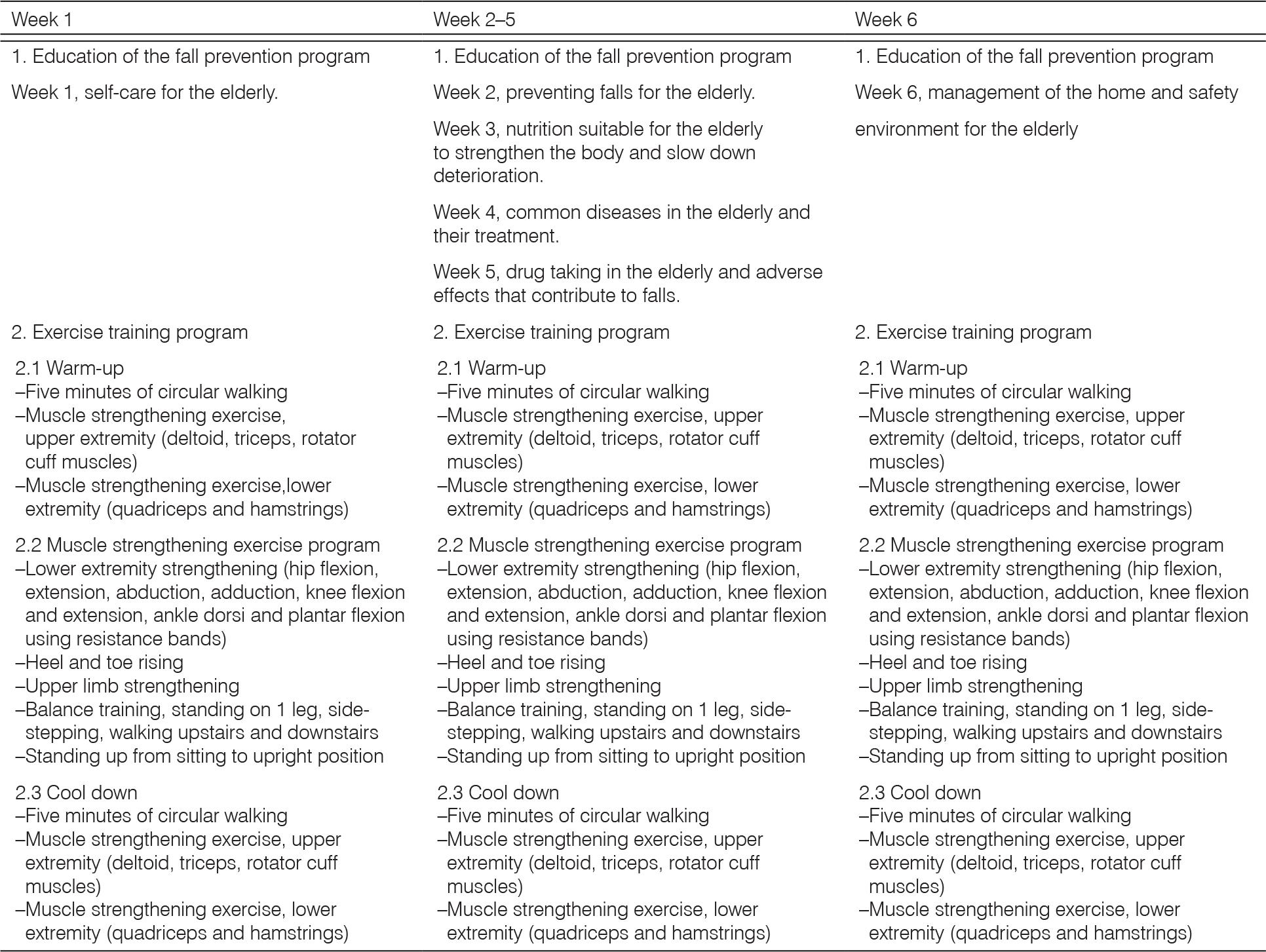 The fall prevention program was developed based on a guide to preventing falls in the elderly by the Ministry of Public Health of Thailand8, and the Otago Exercise Program.19 The program was validated in terms of content, activities, time, and arrangement by 3 experts consisting of a physician who is an expert in geriatric medicine, a physical therapist, and a community nurse who has experience in working with older adults. The fall prevention program included knowledge on daily self-care, fall prevention, exercises, nutrition, common diseases in the elderly, drug taking and management of a home and a safe environment for the older adults (Figure 1). The intervention program was implemented at the elderly school, and the participants in the intervention group were required to attend and train with the program 1 day a week for 6 consecutive weeks, 2 h per session. The control group did not receive any intervention during that period. They were instructed to pursue their habitual daily life activities.