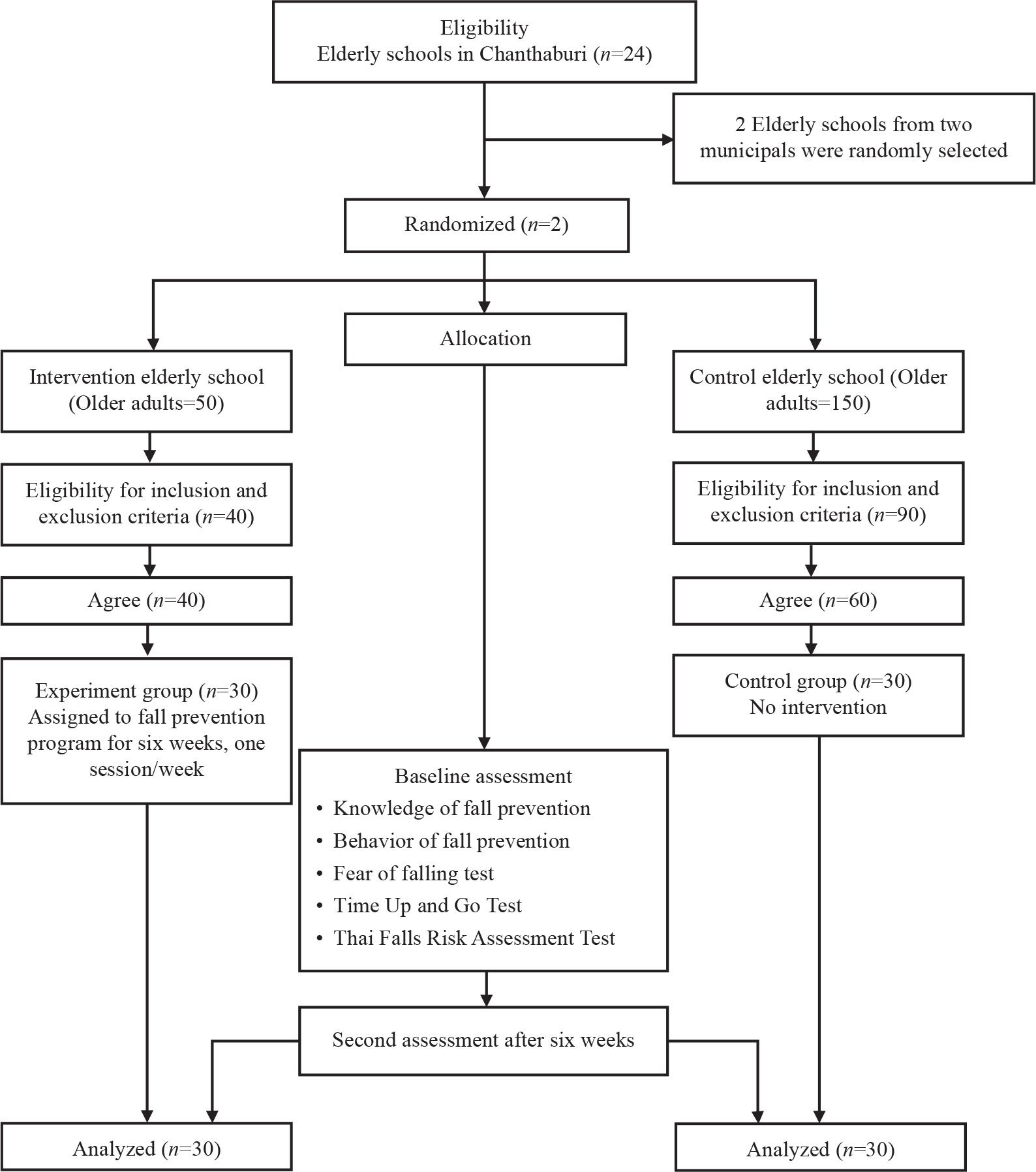 There are 24 elderly schools in Chanthaburi province. The elderly schools are established by sub-district municipalities, which aim to develop the quality of life and promote healthy aging for community-dwelling older adults. Two elderly schools under the supervision of different sub-district municipalities in Chanthaburi province were randomly selected by using a lottery method, then were randomly assigned to either an intervention or a control trial site in order to avoid the potential for contamination of intervention occurring during the trial.