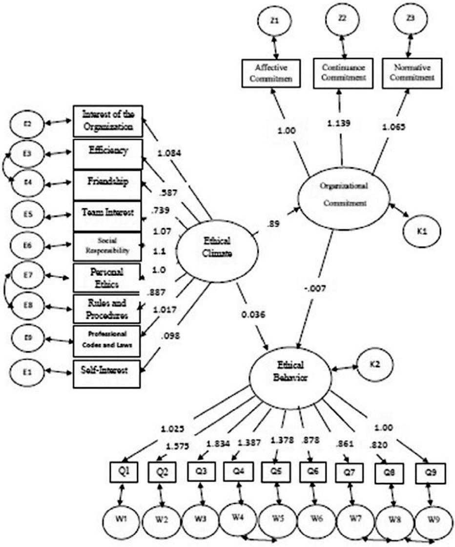 The results show that the organizational commitment variable does not play a mediating role in this model (Figure 2). The perceptions of ethical climate influence organizational commitment (beta = 3.261). The perception of ethical climate influences ethical behavior (beta = 0.121). Furthermore, organizational commitment does not show a significant effect on behavior (Table 4).