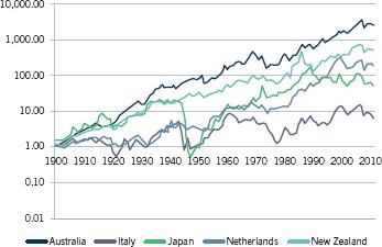 Figure 1 shows the evolution of $1 invested in each of these countries over the full length of the data set (note the logarithmic scale on the y-axis).