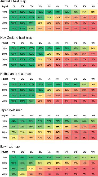 We have highlighted (bold and underline) five countries: Australia (“AUS”); New Zealand (“NZL”); Netherlands (“NLD”); Japan (“JPN”); and Italy (“ITA”), in the table as they represent annualised performance levels that most closely correspond to key percentiles in the distribution of the annualised performance of stock markets over the long run.9