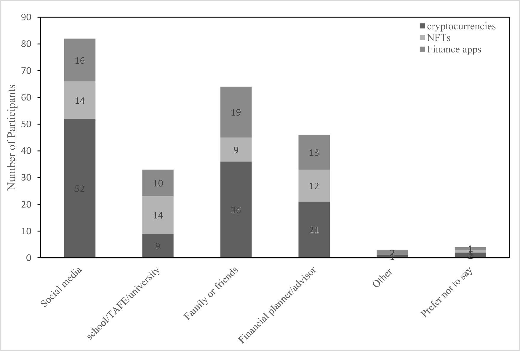 Families or friends also served as a key source of knowledge, with 58.1% (n=36) for cryptocurrencies, 14.5% (n=9) for NFTs, and 30.6% (n=19) for finance apps. Financial planners or advisors were also an important source for participants to acquire cryptocurrencies (n=21, 33.9%), NFTs (n=12, 19.4%), and finance apps (n=13, 21.0%). A minority of participants received information about cryptocurrencies (n=9 14.5%), NFTs (n=14 22.6%), and finance apps (n=10 16.1%) from school, TAFE, or university.