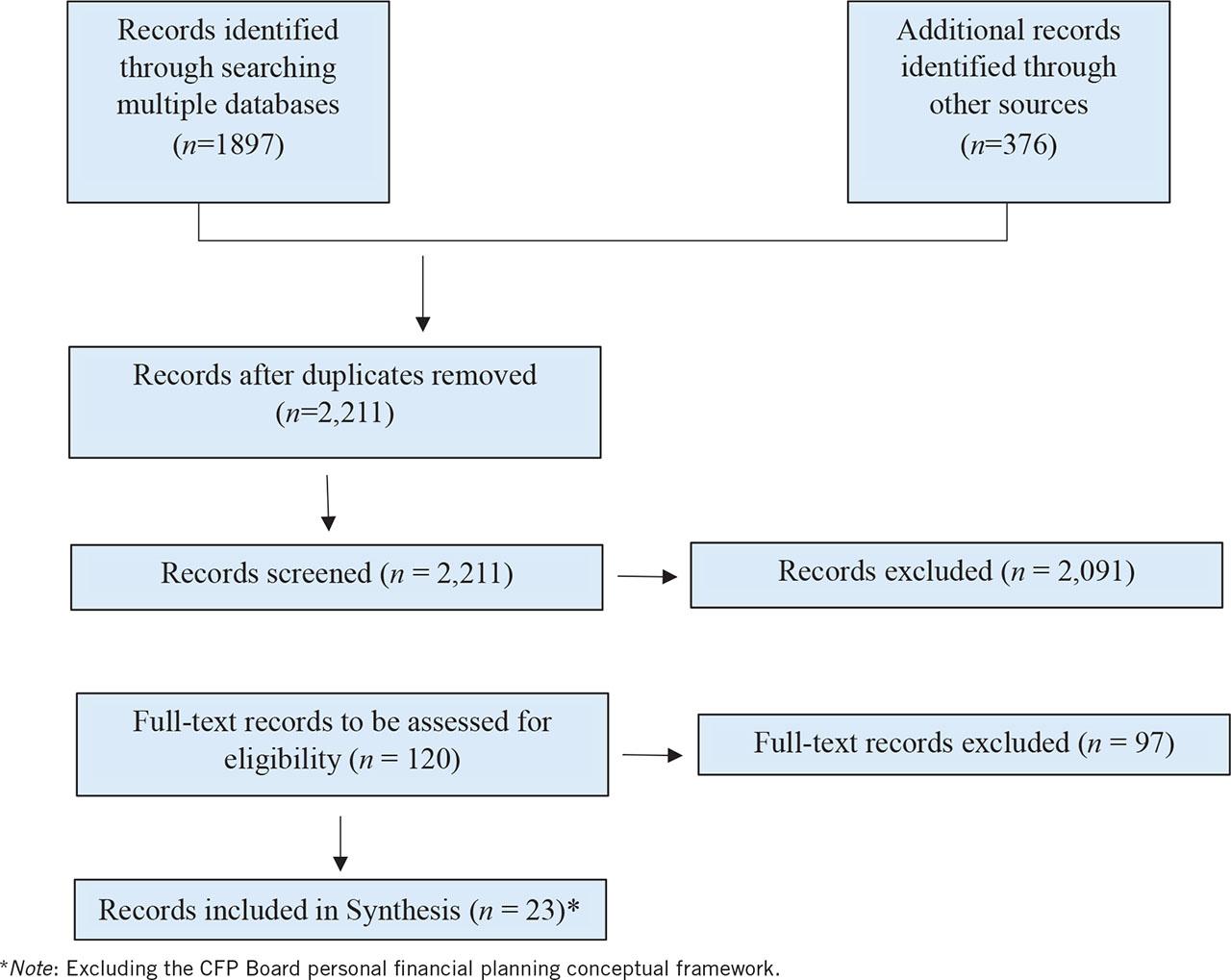 Figure 4 illustrates the selection of the sources of evidence flow according to the PRISMA ScR (Tricco et al. 2018). After removing duplicates, 2,211 documents were identified from database searches, grey literature and citation reviews. Based on title and abstract screening, 2,091 records were removed. The broad search terms generated significant noise in the search results. Common exclusion categories included records about corporate financial planning models and unrelated records that might have included a combination of keywords but were not theoretical works. Full-text records were obtained for 120 records. Of these, 23 met the definition of theory within personal financial planning according to the definitions outlined in this study’s methodology.