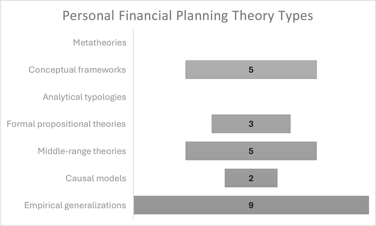 The results show that 38% of the theories are empirical generalizations from systematic literature reviews. Empirical generalizations are essential for giving rise to policy and practise implications and launching and expanding new theoretical channels. Empirical generalizations, particularly in systematic literature reviews, will continue to be essential for further research and theory development. Personal financial planning research has reached a level of maturity and depth where systematic reviews are applicable and influential for summarizing the status and what is needed from future research to fill gaps and inform policy and practise. While researchers can increase and widen the content analysed through systematic literature reviews, researchers should consider converting these findings into formal theory, depending on the robustness of the review data results. For example, Yeo et al. (2024) developed the theory of financial planning behaviour based on a systematic literature review of financial planning behavior guided by the theory of planned behavior. MacDonald et al. (2023) conducted a systematic literature review of the value of financial planning advice, resulting in a multifaceted conceptualization, including the (a) relationship, (b) adviser, (c) environment, (d) advice type, (e) cost, (f) client, (g) quality and (h) outcomes.