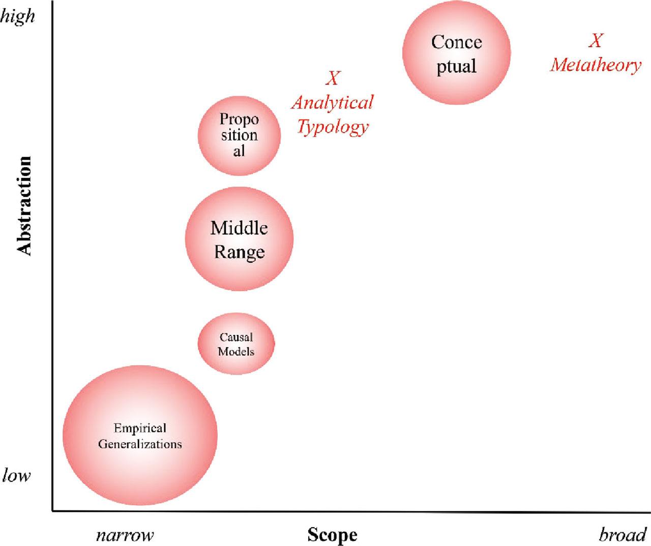 Doherty et al. further described seven different theory types based on their scope and abstraction levels, including (a) empirical generalizations, (b) causal models, (c) middle-range theories, (d) formal propositional theories, (e) analytical typologies, (f) conceptual frameworks, and (g) metatheories. Empirical generalizations are low in abstraction and narrow in scope. They consist of summaries of multiple studies of research findings on a particular topic within existing literature that extend our understanding and generate new ideas about the research topic. For example, systematic literature reviews generate theoretical insights for new theory creation or evaluation of existing theories from empirical generalizations from the literature (Siddaway et al. 2019). Causal models are broader in scope and have less abstraction than empirical generalizations. They focus on a single empirical study that produces evidence for causal and complex empirical generalizations and are often modeled with path analysis or structural equation modeling. Middle-range theories are more abstract than causal models and span the focus to a content area, with testing in several studies of varying types. Middle-range theories are typically used to map causal, direct and indirect effects tested across various studies. Formal propositional theories continue to focus on a particular phenomenon but increase the abstraction level further with a central theoretical proposition that generates several related propositional statements ranging from general to concrete. Analytical typologies have more abstraction and scope than formal propositional theories, representing several content areas that produce generalizations of the social world. Conceptual frameworks are highly abstract and have a broader scope than analytical typologies. Conceptual frameworks comprise a wide set of general assumptions and ideas spanning various fundamental aspects of the social world. They lack precision given their general nature, yet provide meaningful guidance for areas of study, as they point to content areas where new theoretical development and data are needed to understand specific phenomena within the conceptual framework or map. Doherty et al. explained that conceptual frameworks are a ‘road map that must be filled in by theories and data about specific parts of the terrain’ p. 21). Last, metatheories are just as abstract as conceptual frameworks but significantly broaden the scope of content to cover an entire scientific field rather than a unique phenomenon within that field. Doherty et al. noted that the extent of abstraction and scope should not be interpreted as good or bad but simply descriptive, each serving a unique purpose.