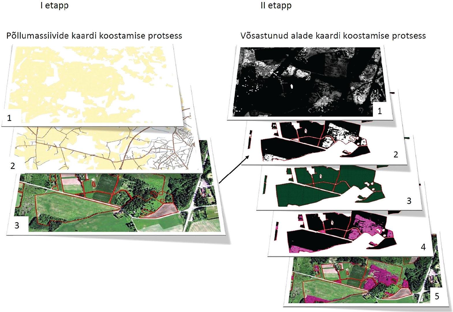 Kõik eelnimetatud GeoTIFF failid ühendati ArcGIS keskkonnas korraldusega Mosaic To New Raster üheks failiks. Saadud rasterkaardist eraldati põllukontuuride alla jäävad alad (II etapp, kaart 2, joonis 1), selleks rakendati ArcGISis korraldust Extraction By Mask. Maskina kasutati esimeses etapis koostatud põldude kaardikihti. Selle tulemusena tekkis uus rasterkaart, kus kõigile maskist väljapoole jäänud pikslitele omistati väärtused ND (No Data). Järgnevalt teisendati saadud rasterkaart vektorkaardiks, kus iga piksli tsentrisse moodustati punktobjekt ja andmetabelisse kirjutati vastava piksli väärtus [grid code]. Pikslite keskpunktid seoti ruumipäringuga põllumassiivide kaardiga, et koos saaks analüüsida põllumassiive ja taimkatte kõrgusandmeid (II etapp, kaart 3, joonis 1). Päringuga eraldati punktid, mille väärtus oli suurem kui null ning moodustati uus punktobjektide fail, milles oli 3 987 087 objekti (II etapp, kaart 4, joonis 1). Nendest 3 987 087 punktist olid 3 062 536 punkti põldude sees nii, et asusid põllu servast vähemalt nelja meetri kaugusel (II etapp, kaart 5, joonis 1). Punktid, mis olid põldude ääres kuni neljameetrises tsoonis, jäid edasisest analüüsist välja. Selleks oli kaks põhjust. Esiteks, puude ja põõsaste kasvamine põldude servas ei tähenda veel, et tegemist on maa mahajätmisega. Teiseks, võrreldes ortofotosid ja laserskaneerimisega leitud üle 1,3 m kõrgusega puittaimestikuga alasid visuaalselt, ilmnes teatud juhtudel umbes ühe piksli suurune (4 m) nihe ortofotodel olevate taimkattega alade ja laserskaneerimisega määratud alade vahel. Kuna põldude ääred on erinevatel põhjustel võsastumise seisukohast ebaselged alad, siis ei arvestatud nelja meetri laiuses tsoonis olevaid punkte võsastunud aladeks, kuigi laserskaneerimise andmed sellele viitasid.