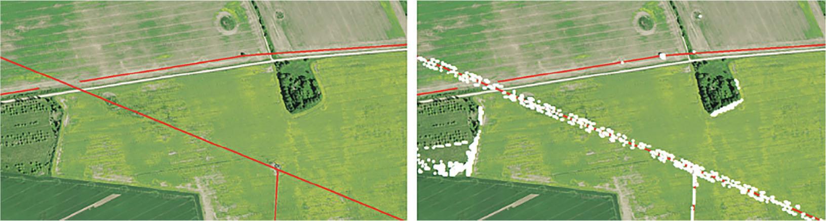 Figure 2. The left part of the figure shows power lines marked with a red line. The right-hand part of the figure shows objects above the ground detected by laser scanning and marked with white dots.