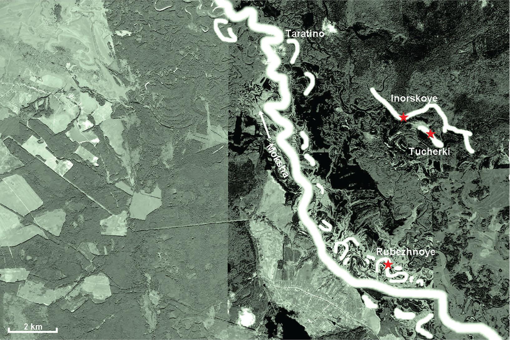 In 1961, L.P. Borodin and I.S. Tereshkin set up three stations to study the desman (two in the Moksha River floodplain, and one in the Sura River floodplain) (Borodin, 1963; Tereshkin, 1971). The first station was laid in the Moksha floodplain between the town of Temnikov and the village of Stary Gorod. The floodplain width in the observation area reached 5 km in diameter. The floodplain is right-sided, mostly open, with a large number of lakes. Many of them had a muddy bottom. Ten lakes (Shirchek, Bobrovoe, Ogorodnoe, Vatazhnoe, Cher-nomutskoe, Starica, Nemcovo, Krasnenkoe, Linevo, Olyushka) with a total coastline length of 8 km were chosen as references. Over the years of observation, the average number of desman burrows per coastline kilometer varied from 2.9 to 4.1.