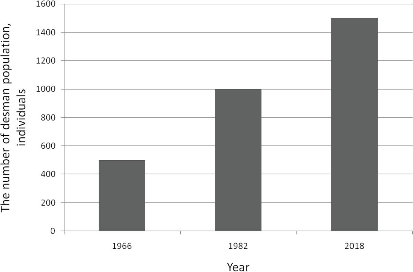 Thus, to date, the number of the Russian desman in Mordovia determined actually as a result of registration work is 588 individuals (Table 1). According to estimates, the total desman population is about 1,400 individuals in Mordovia (Figure 9). As we can see from the desman population dynamics diagram for the period from 1966 to 2018, there is an increase in its population. However, a detailed study of the materials provided by us demonstrates that this is not the case. The fact is that the data for 1966 are given only according to the data of the well-known stations set up by L.P. Borodin, and this is a small territory in Temnikovsky and Kochkurovsky Districts. No data was available on the total species population either for these districts or for other districts. In 1982, V.S. Vechkanov presented data for several districts by extrapolating registration data obtained on areas in four districts. In fact, 149 desman individuals were registered during fieldwork in burrows on lakes. We may conclude that to date the population of the species has not increased, but the number of known desman habitats has increased due to surveys of wide territories in the districts during expeditionary studies in Mordovia. Most scientists see a tendency of a dramatic decrease in the species population in Russia (Onufrenya & Onufrenya, 2016; Rutovskaya et al., 2017b). We can only guess the desman population in the past, but clearly, it was several times higher than now. Because during the studies performed by L.P. Borodin (1970) it was already known that desman trapping exclusively for fur production amounted to 2,493 individuals in the period from 1953 to 1956 in Mordovia. It should be noted that the largest quantity of desman skins in Mordovia was stocked in Zubovo-Polyansky, Temnikovsky and Tengushevsky Districts (71%), that is, the Moksha basin. It is noteworthy that the situation has not changed and these areas are currently the main ones in desman conservation in the region. However, the situation is not clear in Krasnoslobodsky District where the desman is also favorably distributed throughout the reservoirs. And at the time of L.P. Borodin’s work there was no information on the district at all, not only on fur production (stock), but also in general. The desman probably settled extensively in the floodplain of Krasnoslobodsky District after 1970.