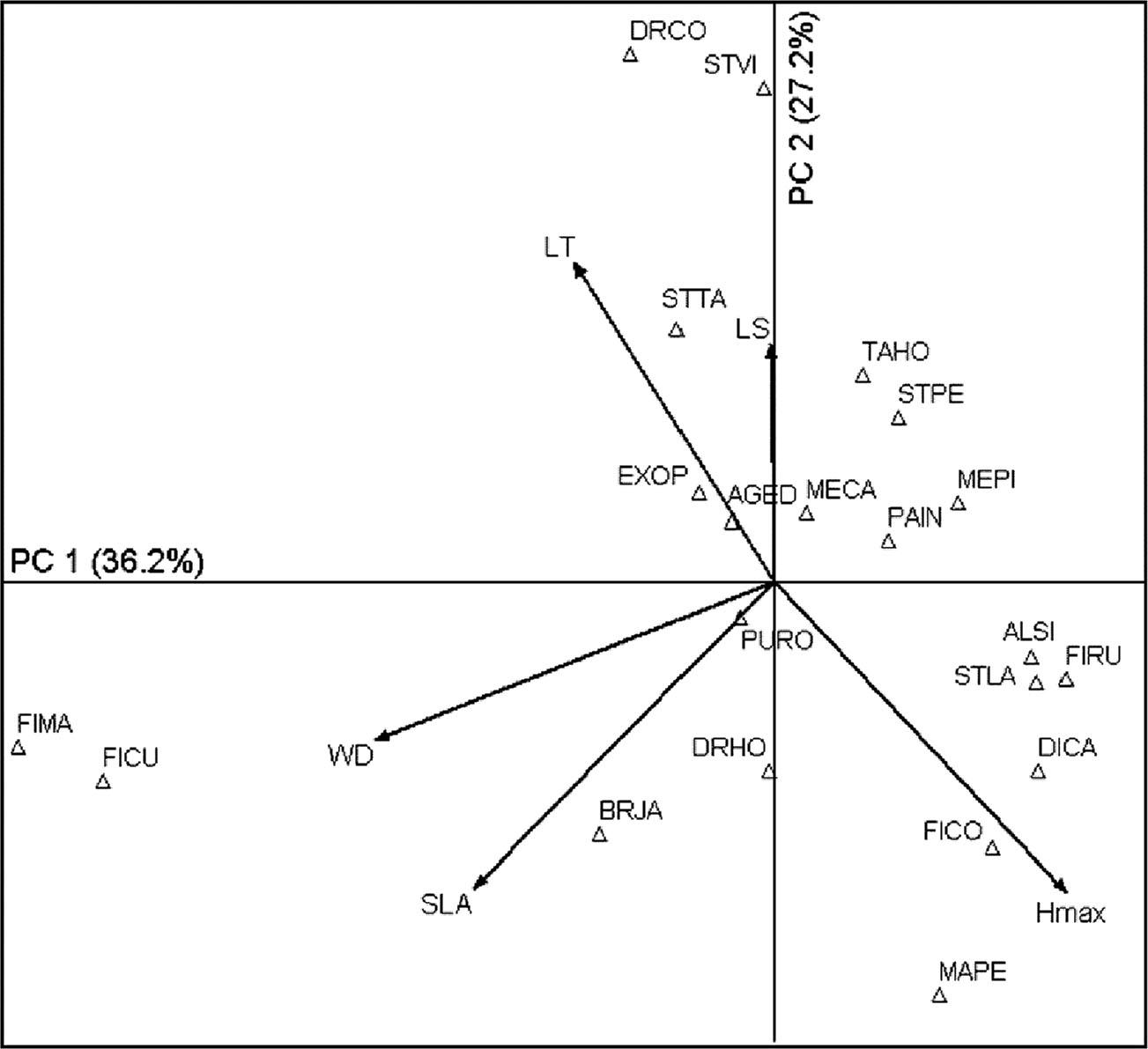 Principal component analysis (PCA) ordination plot of functional trait variables (leaf size [LS], specific leaf area [SLA], leaf thickness [LT], wood density [WD], and maximum plant height [Hmax]) indicating the tree species (Δ) in three forest sites growing along an altitudinal gradient on a limestone hill in Phrae Province, northern Thailand. Species abbreviations are listed in Appendix 1.
