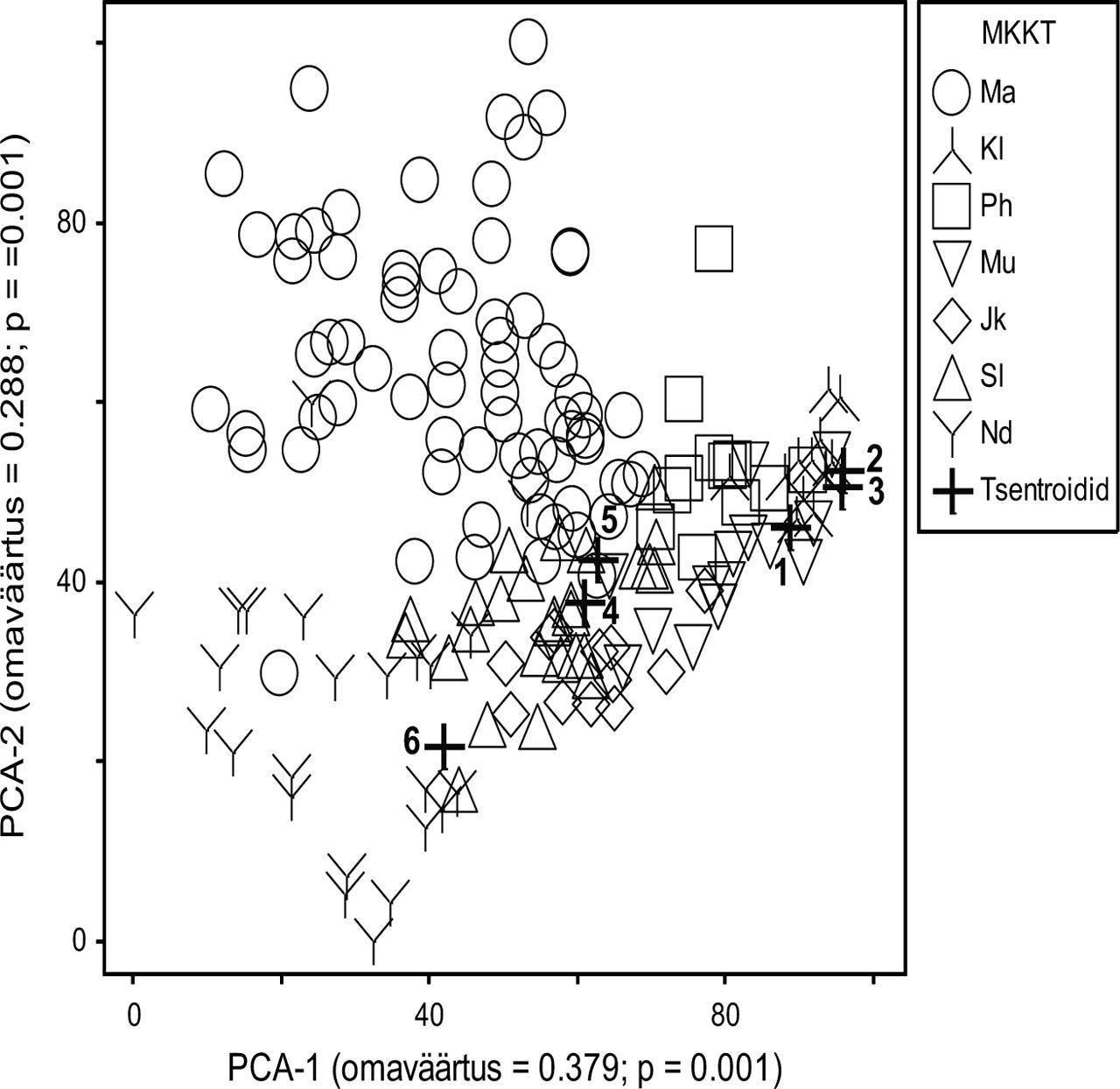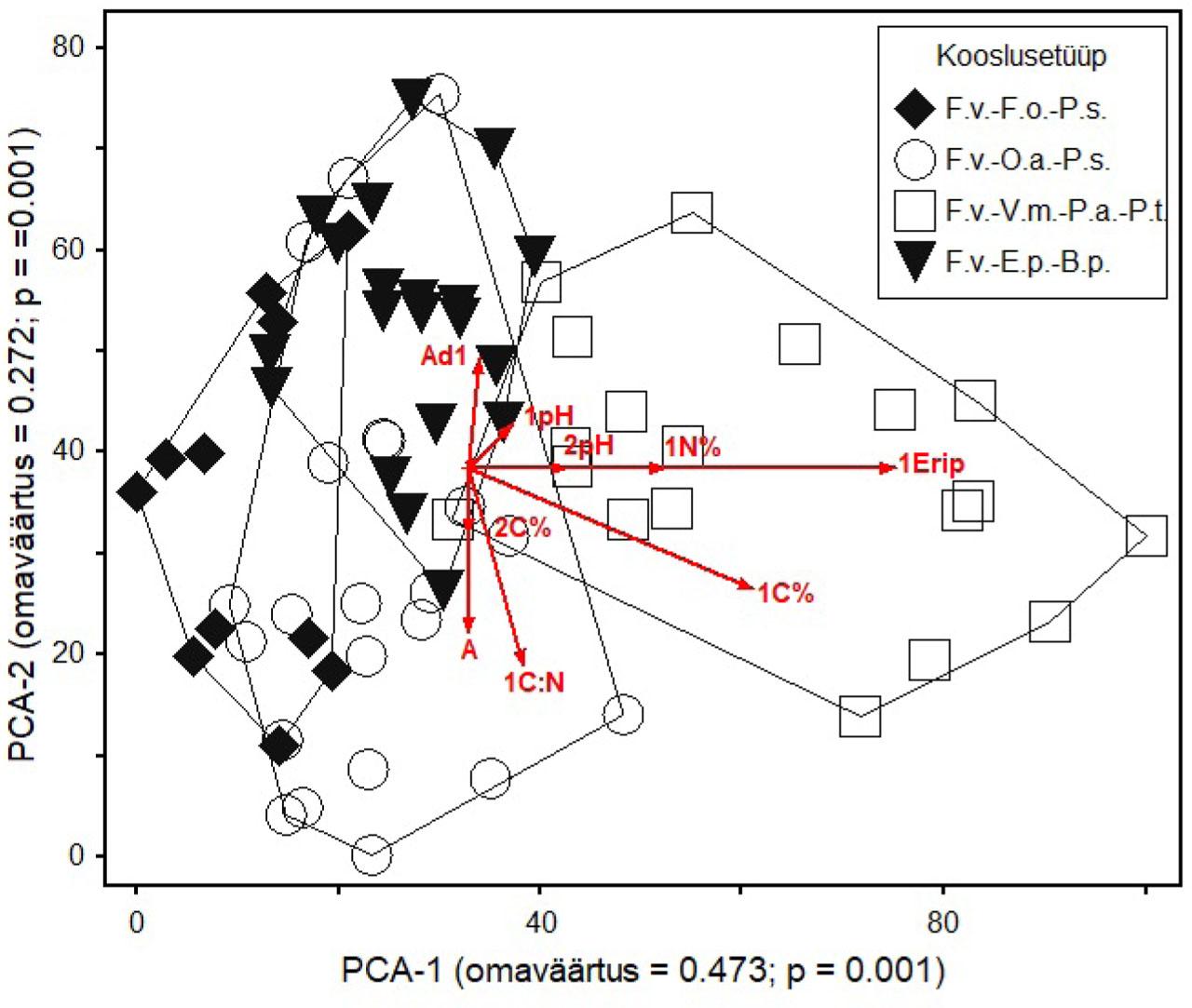 Taimekoosluste ja mullaomaduste ühisordinatsiooniks rakendasime peakomponentanalüüsi (principal component analysis) (Ter Braak & Šmilauer, 2002).