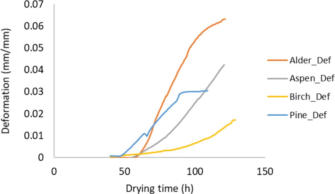 A comparison of the total deformation in the surface layer depending on the drying time, for different tree species.