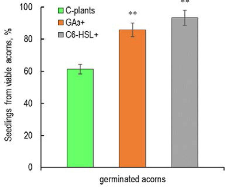 Effect of pre-sowing treatment of acorns with GA3 and C6-HSL solutions on the total content of endogenous phytohormones in 47-day-old Quercus robur seedlings, ng/g FW_