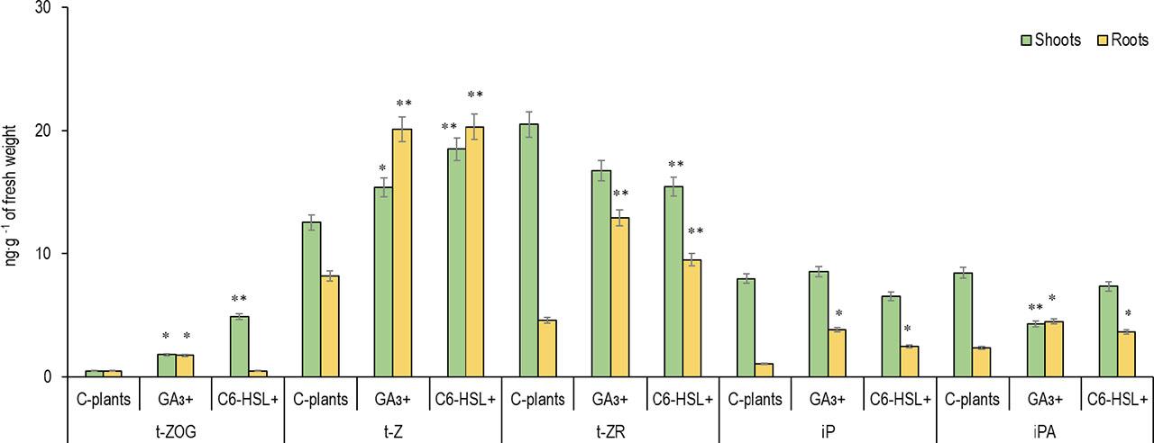 Effect of pre-sowing treatment of acorns with GA3 and C6-HSL solutions on the total content of endogenous cytokinins in the shoots and roots of 47-day-old Quercus robur seedlings, ng/g FW_