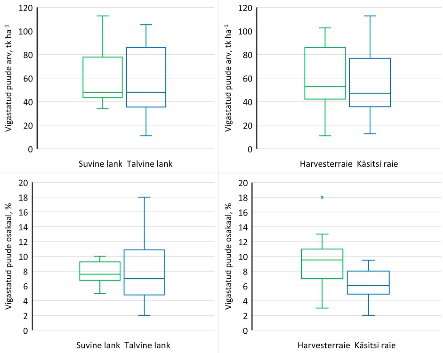 Vigastatud puude osakaal raie järel allesjäänud puudest oli kõigil raielankidel keskmiselt (± standardhälve) 7,8 ± 3,3%, suvistel lankidel 7,7 ± 1,6% ja talvistel lankidel 7,9 ± 3,9% ning harvesterraiel 9,3 ± 3,6% ja käsitsi raiel 6,2 ± 2,1%. Erinevus harvesterraie ja käsitsi raie vahel osutus usaldatavalt erinevaks (p < 0,01). Joonisel 1 on esitatud karpdiagrammid vigastatud puude arvu ja osakaalu kohta raie järel lähtuvalt raiumise ajast ja viisist.