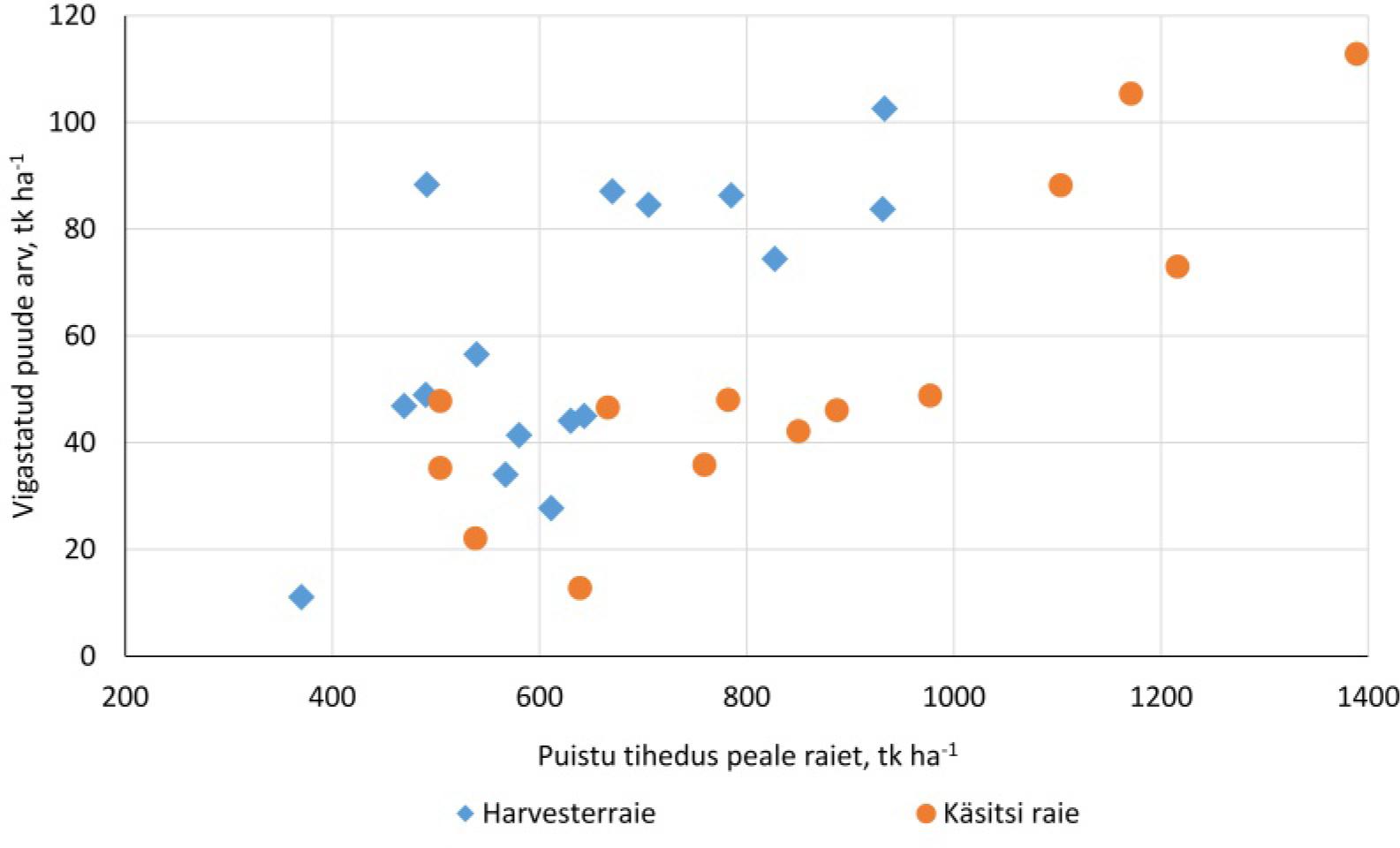 Joonisel 2 on esitatud harvendusraiel vigastatud puude arv raielankidel sõltuvalt raiemeetodist ja raiejärgsest puistu tihedusest. Mida tihedam oli puistu nii enne kui ka peale raiet, seda rohkem oli ka vigastatud puid hektari kohta (p < 0,01).