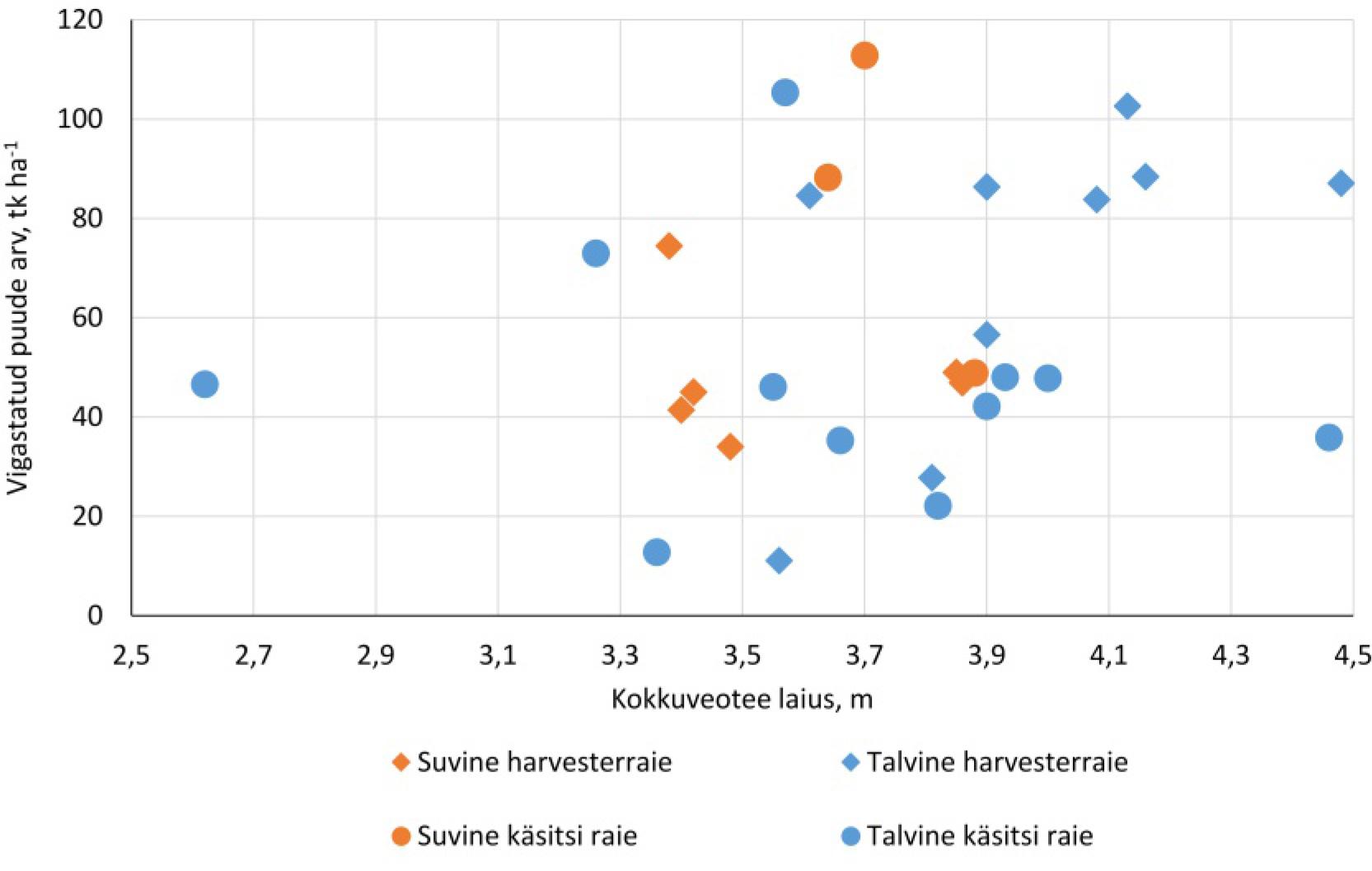 Joonisel 3 on esitatud vigastatud puude arv harvendusraie järel sõltuvalt kokkuveoteede keskmisest laiusest, raie tegemise ajast ja viisist uuritud raielankidel. Otsene seos nende tunnuste vahel ilmselt puudub. Kokkuveoteede keskmine laius kõigil raielankidel (± standardhälve) oli 3,76 ± 0,40 m, harvesterraie lankidel 3,85 ± 0,37 m ja käsitsi raie lankidel 3,67 ± 0,42 m; suvistel lankidel 3,72 ± 0,36 m ja talvistel lankidel 3,79 ± 0,42 m. Need näitajad ei osutunud statistiliselt usaldatavalt erinevaks. Kokkuveoteede kogupindala kõigil raielankidel kokku oli 12,70 ha ehk 19%, olles erinevatel lankidel vahemikus 4% kuni 48% vastava raielangi pindalast.