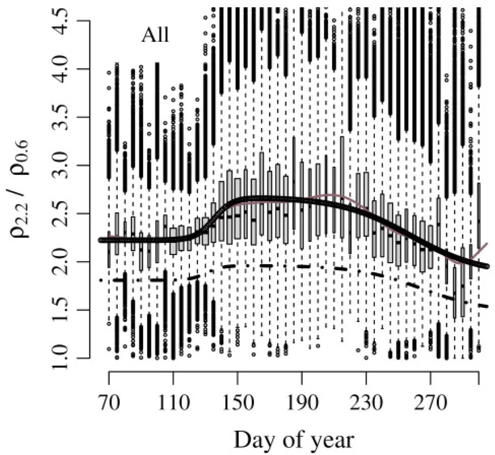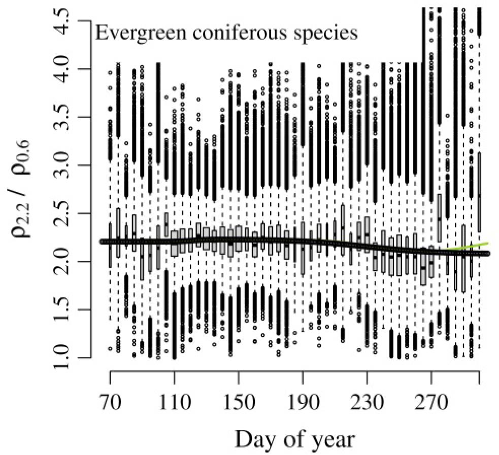 (B) In the birch stand groups the seasonal changes in ρ2.2/ρ0.6 are found to follow those of the pooled deciduous broadleaved group. The autumn minimum is, however, more pronounced in the stands growing on fertile soils (as can be seen by comparing Figure A1.6 against Figures A1.5 and A1.7). The ρ2.2/ρ0.6 value increases remarkably during the growth season, attaining values around 3 for several months. In the European aspen stands the ρ2.2/ρ0.6 value increases even more, with 5-day bin medians yielding ρ2.2/ρ0.6 ≥ 3.25 (Figure A1.8, Table A2.1). Otherwise, however, European aspen stands and birch stands exhibit similar seasonal values. The grey alder stands reach the greatest values of ρ2.2/ρ0.6 among all groups, with 5-day bin medians rising even as high as 3.5, and they differ somewhat in their seasonal courses from birch and European aspen stands (Figure A1.9, Table A2.1). There is in their case no rapid increase phase in the spring, with the ρ2.2/ρ0.6 seasonal course instead almost symmetrical around the summer solstice. Nevertheless, the springtime plateau before budburst is detectable, as in the other deciduous broadleaved species groups. An interesting pattern can be found during the late summer period, from day 250 until day 280, when the decrease in ρ2.2/ρ0.6 is replaced by a temporary increase before the final decrease sets in.