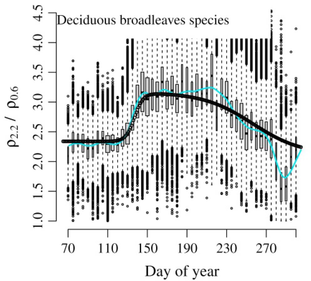However, the seasonal ρ2.2/ρ0.6 value for evergreen needleleaf forests is found not to depend so strongly on the time during the season. Although the 5-day averaged values indicate small fluctuations, variability around the mean values in each 5-day bin hides most of the possible seasonal changes, and the double logistic phenology model (1) predicts only a marginal increase for the mid-summer (Figure 2). This independence of the evergreen needleleaf ρ2.2/ρ0.6 value from the day of the year is indicated also by the almost zero value of the determination coefficient (Table 3). In contrast to the evergreen needleleaf tree species group, the deciduous broadleaved species group is found to exhibit substantial dependence on the date during the growth season (Figure 3). While there is not much difference in the springtime inflection point kpk, the autumn inflection point kps, of the phenology model occurs 7 to 10 days earlier, in comparison both to the landscape average and to the evergreen needleleaf stands (Table 3). The autumn ρ2.2/ρ0.6 minimum is much more pronounced than in the landscape-level average (Figure 3). However, the model (1) is not flexible enough to capture such small fluctuations. On the other hand, the splinebased smoothed model (Table A2.1) follows the phenomena rather well. We find that during the autumn minimum the median values of ρ2.2/ρ0.6 can decrease even to about 1.5 for about 10 days.