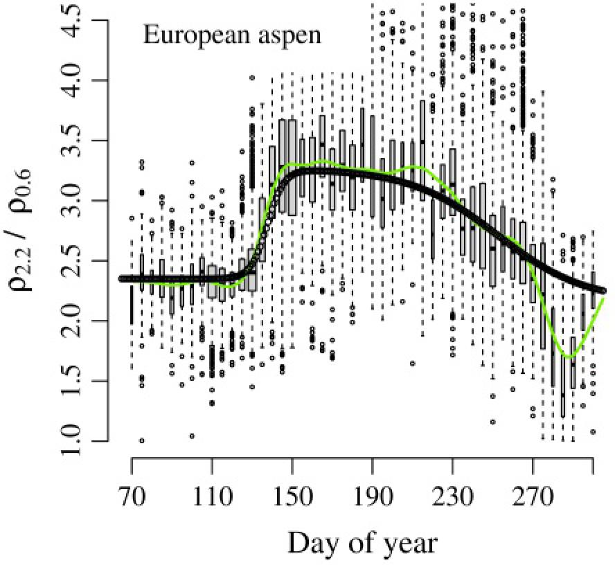 Smoothed course of the near-infrared/red reflectance ratio ρ2_2/ρ0_6_ Values are scaled by 100_ Group descriptions are given in Tables 1 and 2_