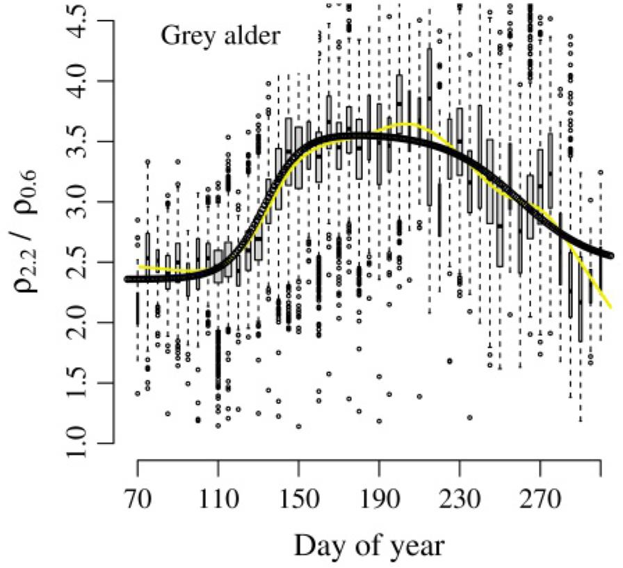 | Grey alder (LV) | 4.3 × 104 | 0.49 | 0.61 | 2.36 | 0.82 | 0.90 | 131.0 | 9.27 | 257.5 | 18.9 |
