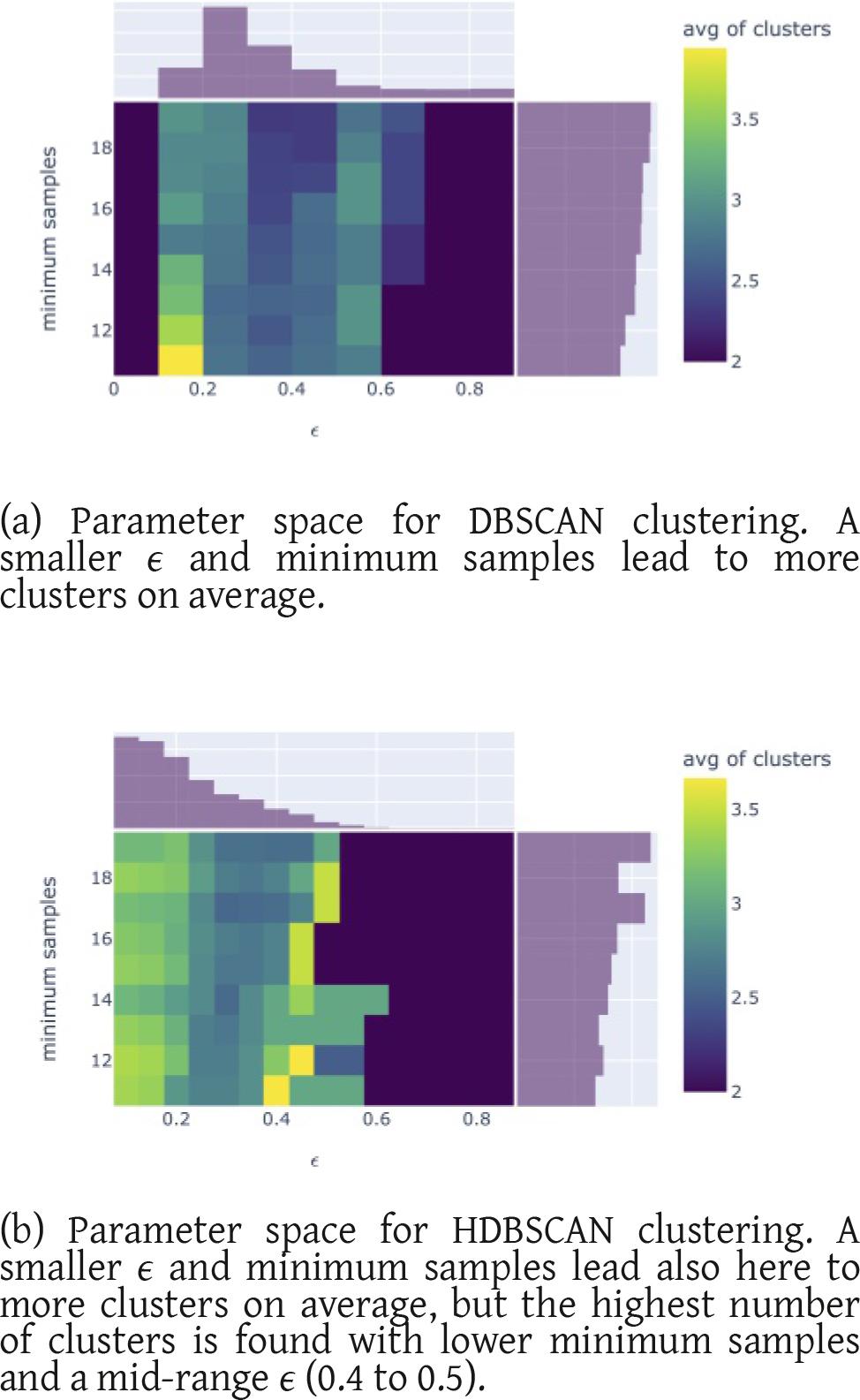 Figures 1a and 1b visualize the hyperparameter space for ϵ and minPts for the robust scaling. Figure 1a suggests DBSCAN according to the marginal distributions for which the fitting hyper-parameters are ϵ = 0.3 and minPts ∈ [17, 20]. We would obtain about three clusters. In the case of HDBSCAN (Figure 1b) the cluster detection is finer-granulated even though we used exactly the same steps during calculations. In line with the results in Table 1 we have the highest probability with small ϵ ≈ 0.2 and also minPts ∈ [17, 20] and the number of clusters detected are between 3 and 4 mostly in that parameter range.