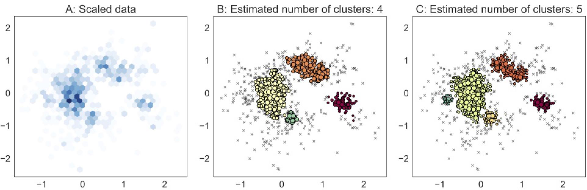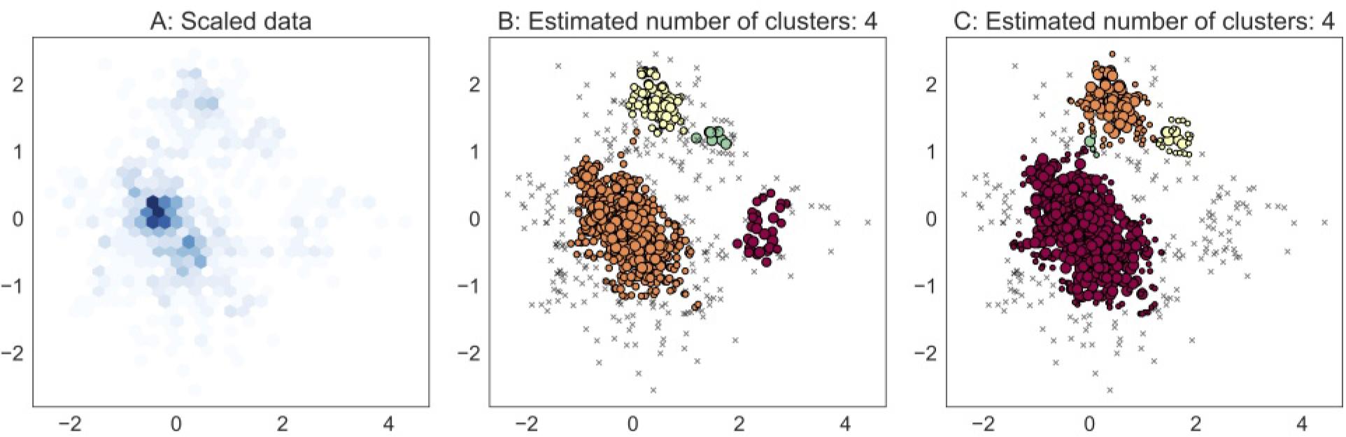 Example of clusters detected among data for July 2015 with parameters ϵ = 0.3 and minPts = 15. Panel A shows the data scaled by the RobustScaler function and the color denotes the number of points per grid cell with a darker color for higher frequency. Panel B shows the estimated clusters using HDBSCAN, and C by DBSCAN. Note: The order in cluster labelling is different for the algorithms and therefore the coloring differs.
