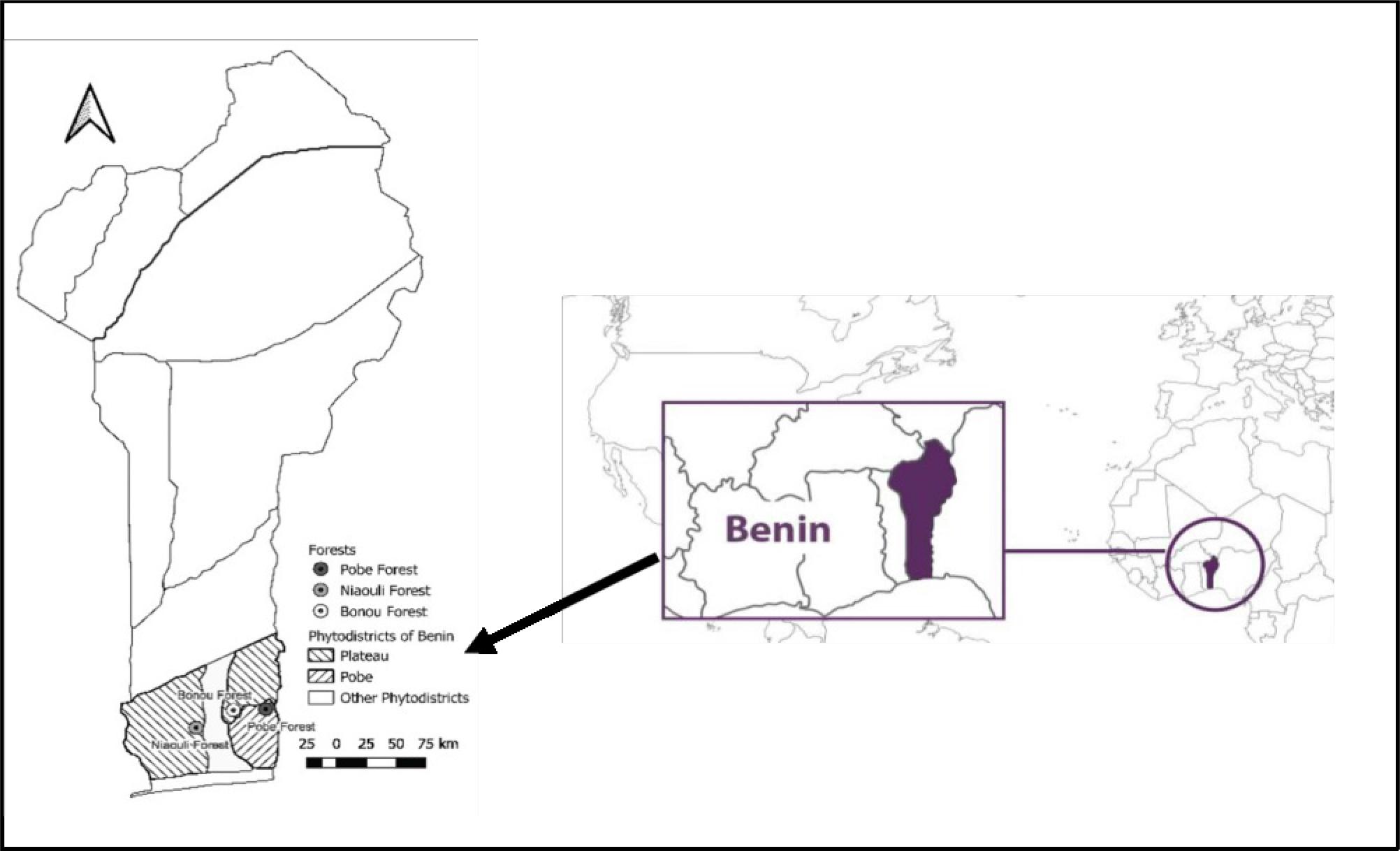 The primary objective of this project is to conduct a comprehensive assessment of wood resources within three key natural ecosystems of southern Benin (Niaouli, Bonou and Pobè forests). Each forest possesses its own distinct characteristics, ranging from vegetation composition and structure to ecological functions and conservation significance. A study based on a phytosociological and phytogeographical approach to plant formations in Benin (Adomou, 2005) has identified 10 major floristically homogeneous regions known as phytodistricts. Microhabitats and ecological disturbances play important roles in shaping plant diversity dynamics in Benin. Nagel et al. (2004) have highlighted the significance of microhabitats, such as forest edges, riparian zones, and disturbed areas, in supporting unique plant communities. Ecological disturbances, such as fire events and invasive species encroachment, can also alter plant diversity patterns over time, as noted by Nagel et al. (2004) and Ahononga et al. (2020). Comparing the ecological attributes and biodiversity patterns of the three forests offers a unique opportunity to explore the diverse array of ecosystems within southern Benin. Understanding the diversity and typology of wood species within these forests is essential for sustainable management practices that balance conservation efforts with economic development (Lescuyer et al., 2016; Assogbadjo et al., 2017).