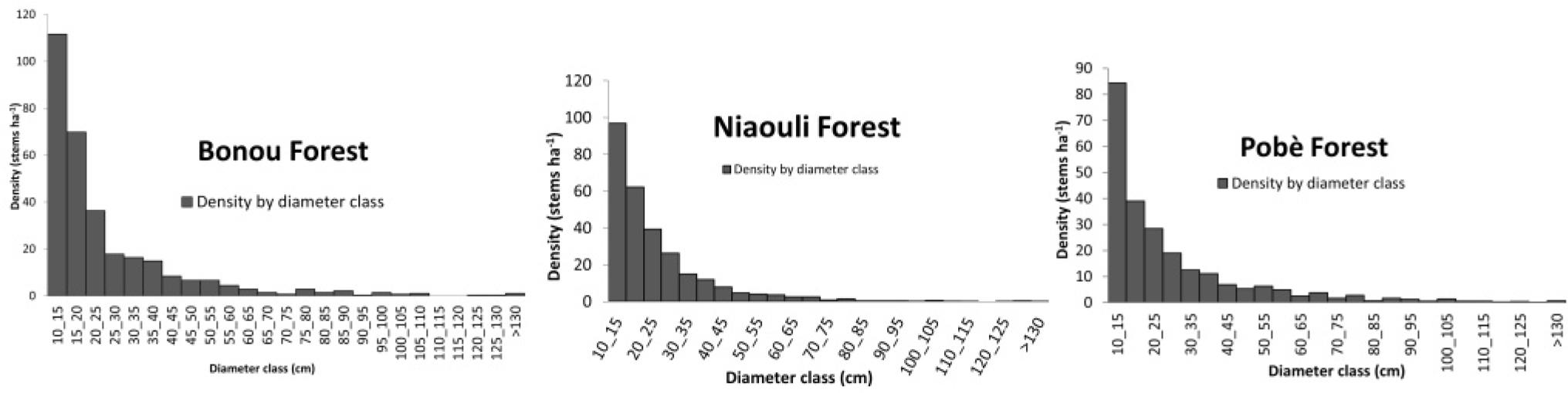 Analyzing diameter structure is a well-established method to assess forest health, stand dynamics, and disturbance impacts (Hitimana et al., 2004). By examining each diameter class, we gain insights into regeneration and recruitment rates, crucial indicators of forest vitality (Legilisho-Kiyiapi, 1998; Botkin, 1993), and to compare recruitment between different forests (Kigomo et al., 1990). In this study, the diameter structures of Bonou, Pobè, and Niaouli forests display an inverted J shape, commonly associated with non-degraded, multi-species stands (Kigomo et al., 1990). This distribution, which reflects a high density of smaller-diameter trees, suggests robust regeneration processes and resilience across these forests.
