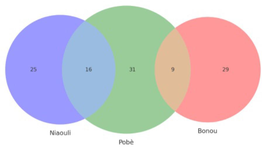 The index for Bonou and Niaouli stands at 0.41, showing that about 41% of the species in Bonou are shared with Niaouli. This suggests an intermediate level of similarity, meaning Bonou and Niaouli, like Bonou and Pobè, share a considerable proportion of species while maintaining distinct floral communities. The similarity index between Pobè and Niaouli forests is 0.40, indicating that these two forests share 40% of their species. This slightly lower similarity could be due to varying environmental factors, historical land use differences, or distinct soil compositions, which can influence species diversity and distribution (Magurran, 2003; Socolar et al., 2016).