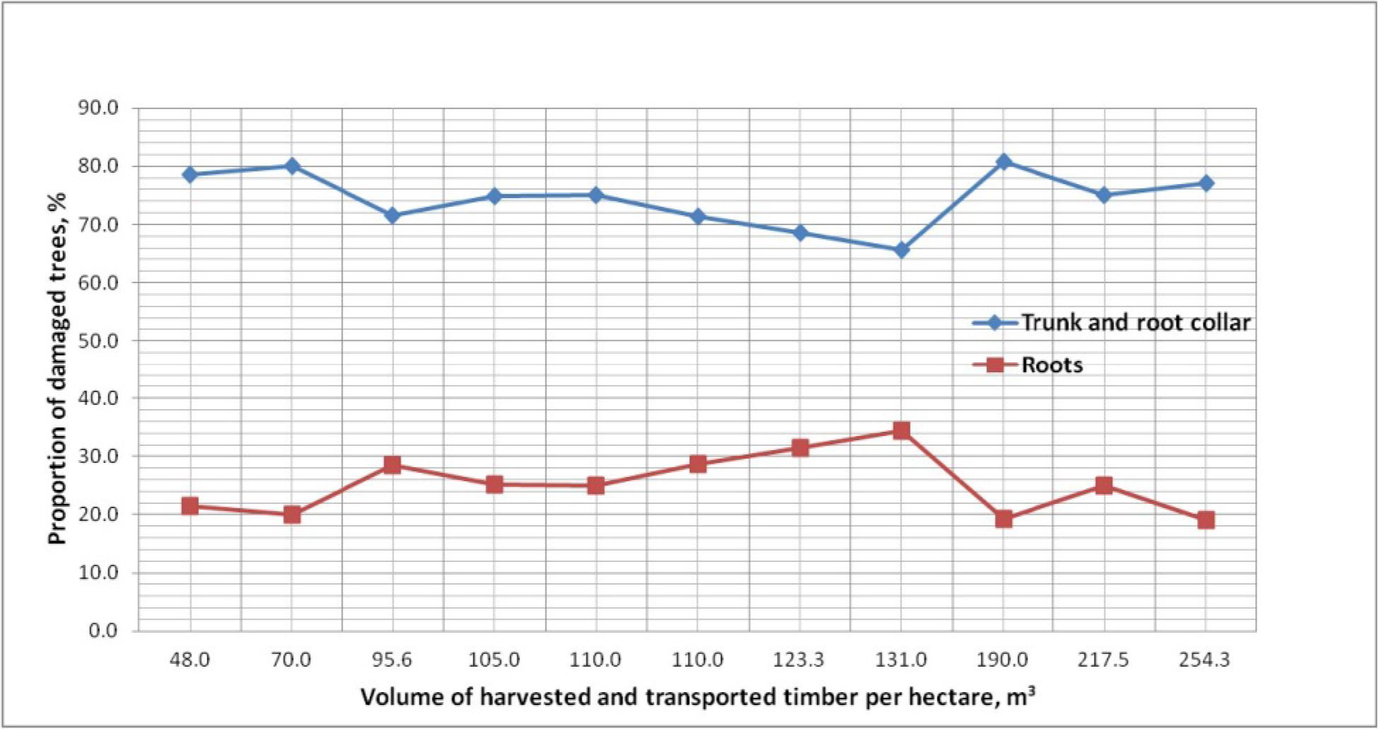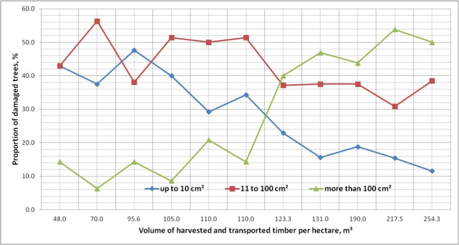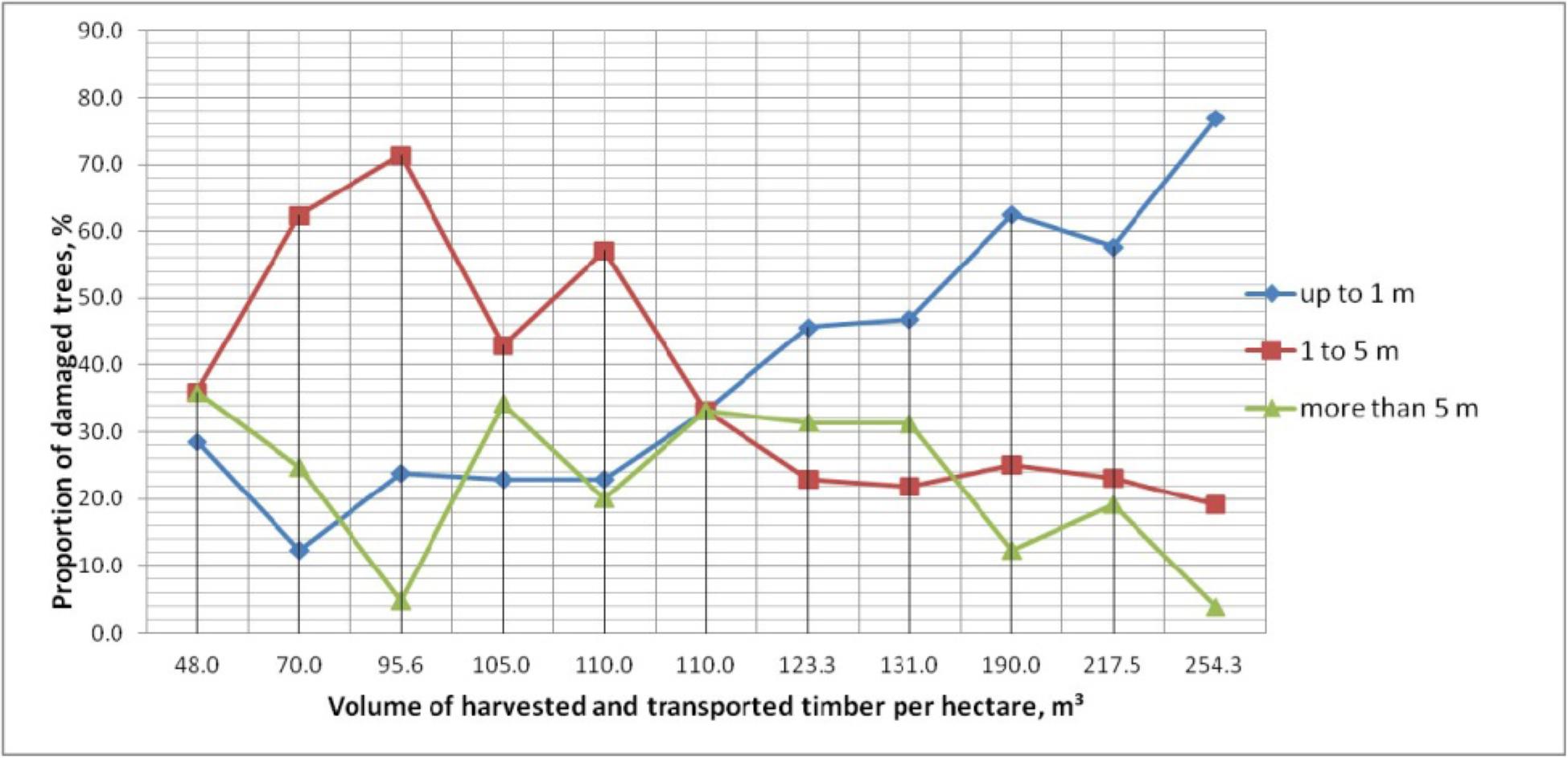 It was found that the number of damaged residual trees per hectare varied from 14 to 39, averaging 30 trees per hectare. The damage intensity – defined as the percentage of damaged trees among all remaining trees – ranged from 5.0% to 15.2%, with an average value of 9.3%.