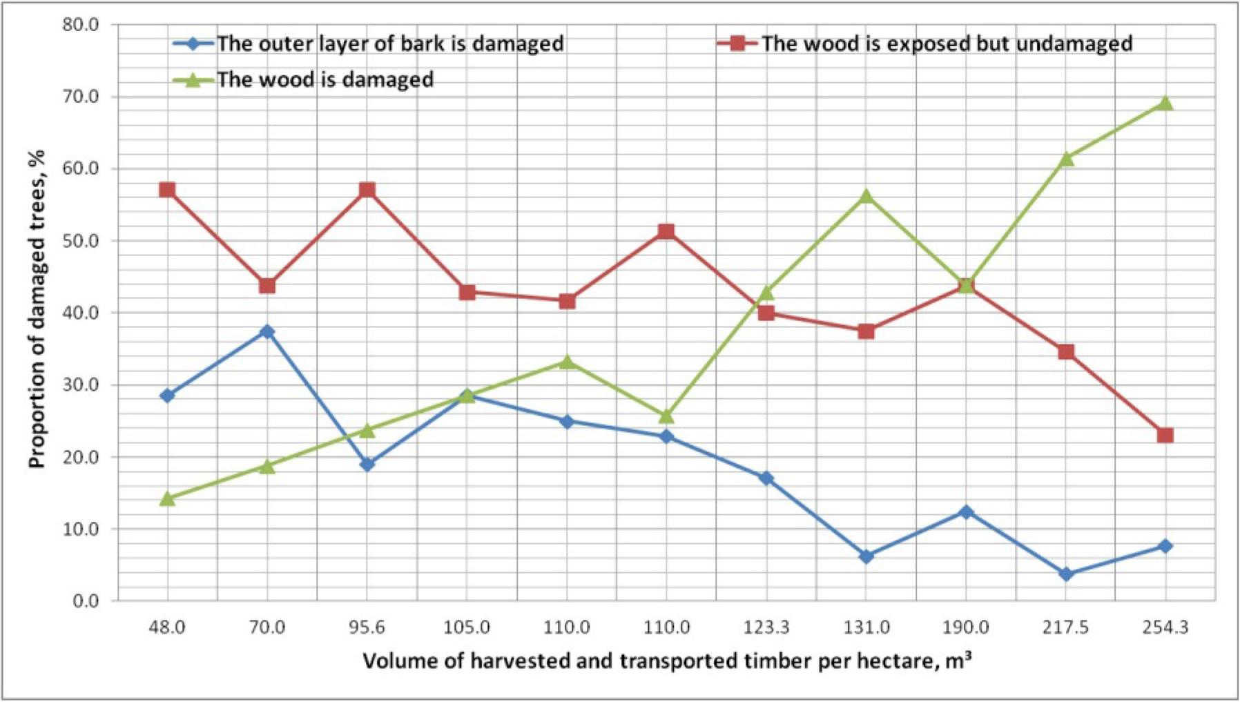 Increasing the volume of felled and skidded timber leads to a higher proportion of trees with deep wood injuries, negatively affecting their viability and future wood quality. A high share of trees with exposed but undamaged wood indicates a potentially critical risk zone – such trees may quickly lose vitality under additional stress. It was found that beyond 120 m3 ha−1, there is a sharp increase in deep injuries.