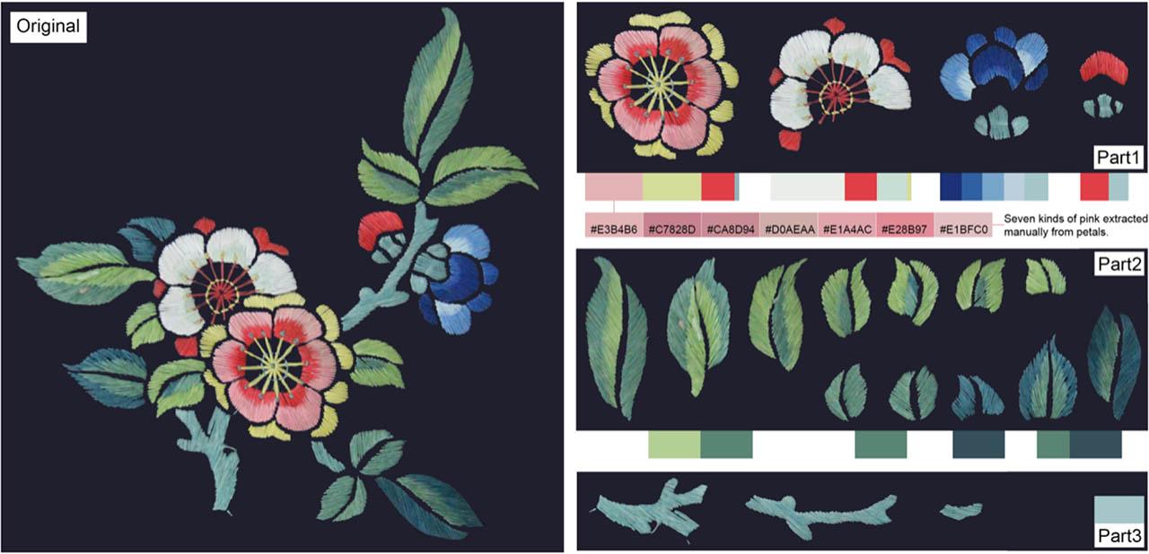 The example of embroidery complexity was taken of a Qing Dynasty embroidery pattern in Folk Costume Museum of Jiangnan University (Figure 2 - Original). The embroidery pattern consists of flowers, leaves and branches. The flower part comprises two front flowers, a side flower and a bud, the latter of which consists of pedicels and calyx. There are 12 leaves of different sizes and three branches. Each leaf is divided into two halves by the central vein. In addition to the stamens, each graphic is left with a narrow and smooth gap, and the stamens are very complex in shape. It is composed of radial line ends connected with dots, and the petal shape is also connected through lines. The embroidery pattern is rich in colours. The petal colours include red, pink, yellow, white, light green and four different shades of blue. Each of the larger petals has two colours. When the colour is extracted manually, the same colour, such as pink, is different among different positions. It is difficult to determine which pink can be used as the representative colour (Figure 2 – Part 1). A leaf consists of three different shades of green (Figure 2 – Part 2). Branch, pedicel, and calyx are the same greenish blue (Figure 2 – Part 1, Part 3). When the contour is extracted manually, each point, line and surface contour should be selected in turn, which is repetitive and time-consuming. Therefore, a more complex work is more difficult to be extracted manually by graphics software, and a suitable algorithm is more than needed to quickly and accurately identify the colour and extract the contour.