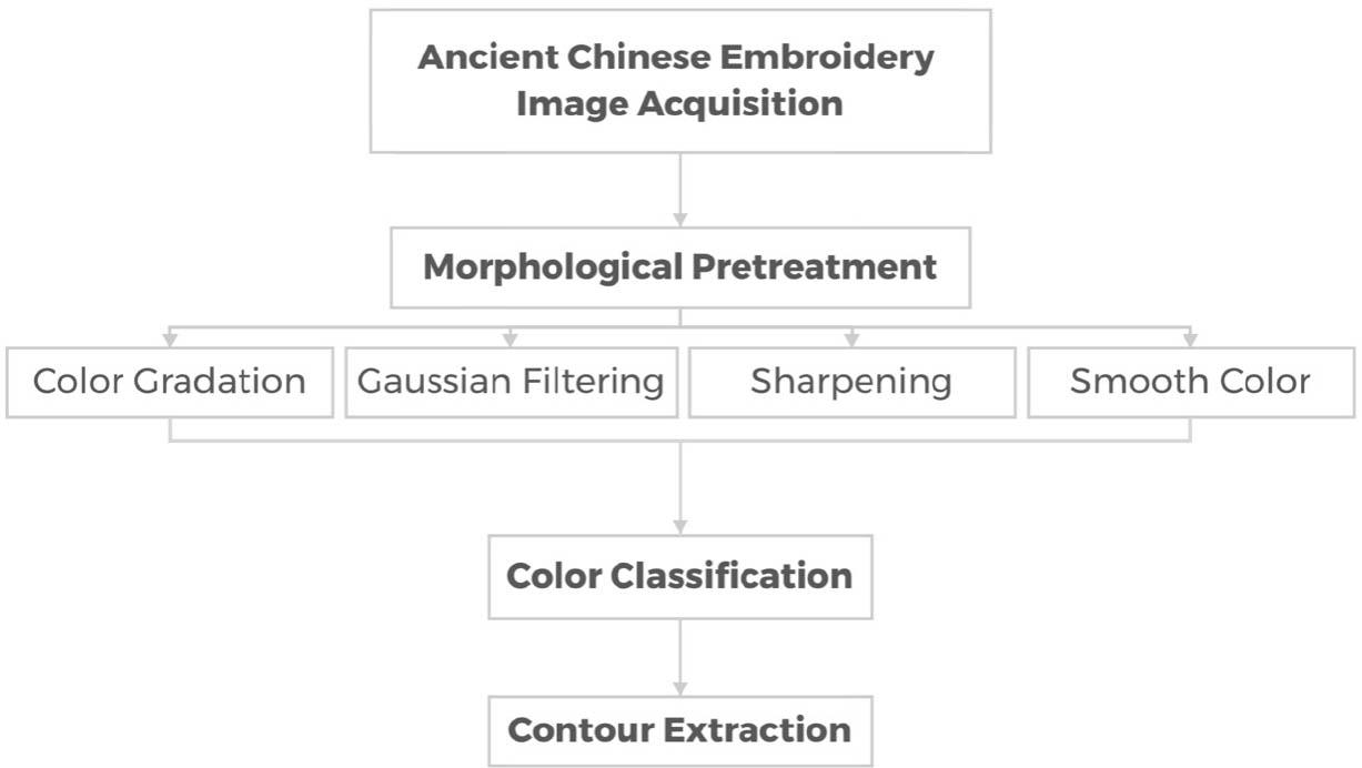 In this study, an effective colour clustering and edge detection method is proposed to recognise colour and contours from ancient Chinese embroidery patterns. It innovatively adds colour level adjustment and sharpening in the process of image preprocessing, which can effectively recognise the colour information of three channels in RGB spaces of an embroidery image taken by digital camera, smartphone photography or scanned by portable scanner. After preprocessing, K-means++ clustering is used for colour clustering. Then the contour is extracted by the Canny operator.