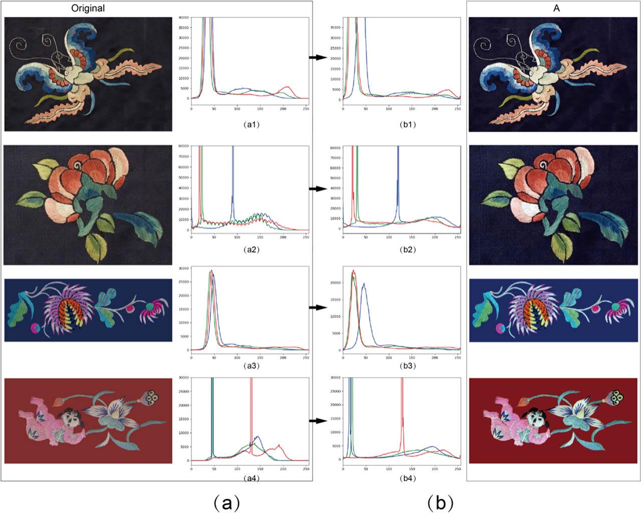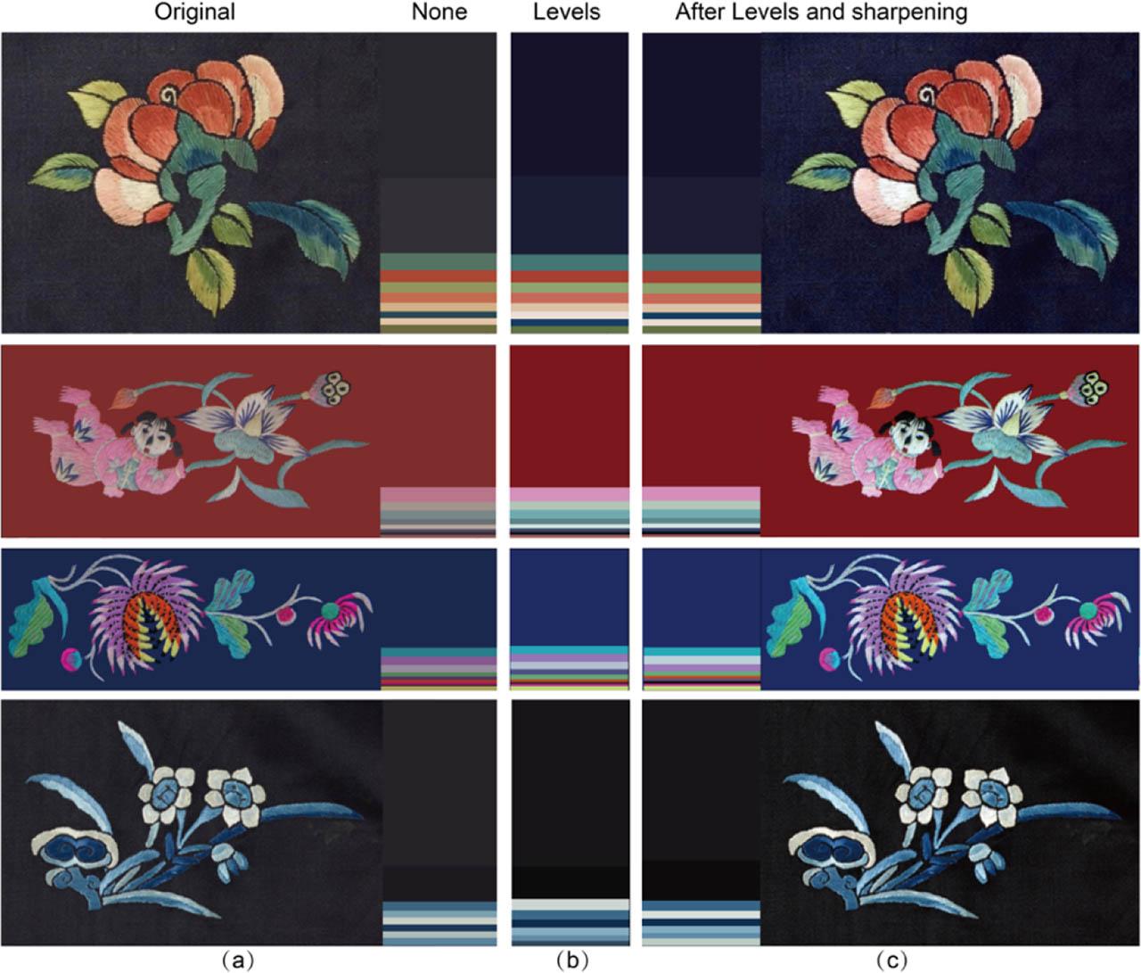 Because the image acquisition was from ancient Chinese embroidery, a part of the physical colours are dim due to age or the influence of environmental illumination, which slightly affect the hue and saturation and thus are not conducive to colour and contour extraction. After the above adjustment, the colour and edge of the image can be optimised, which is more conducive to colour and contour extraction.