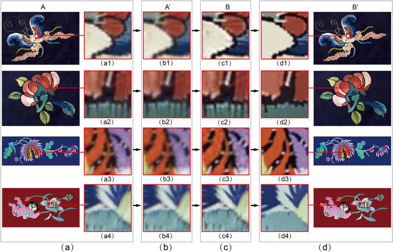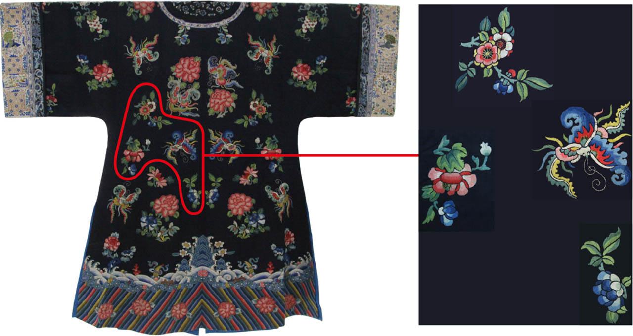 To further verify the applicability of the method, we selected a traditional Qing Dynasty women's clothing, and took four adjacent embroidery patterns for processing (Figure 9).