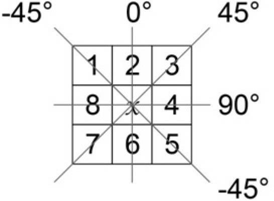 By comparing the size of the corresponding domain values in the 3×3 domain, the pixel points and the two adjacent pixel points at the corresponding angle are compared to eliminate the non-maximum value (Figure 7).