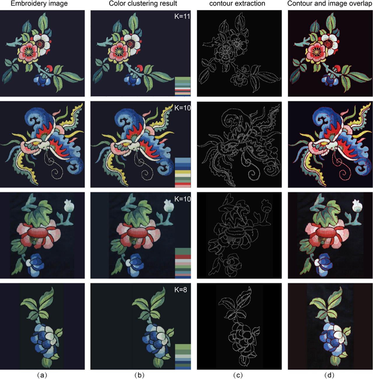 The new method enables accurate and intelligent recognition of colours and contours from embroidery images and can be used in colour collocation and element application in a wider design field. On this basis, we will make a mobile app and web tools for designers to extract the colours and contours of ancient Chinese embroidery patterns, solve the defects of difficult colour clustering and slow contour extraction faced by designers when using computer-aided graphics software to extract the colour and contour manually, and assist designers to extract the colours and contours from ancient Chinese embroidery patterns more quickly and conveniently.