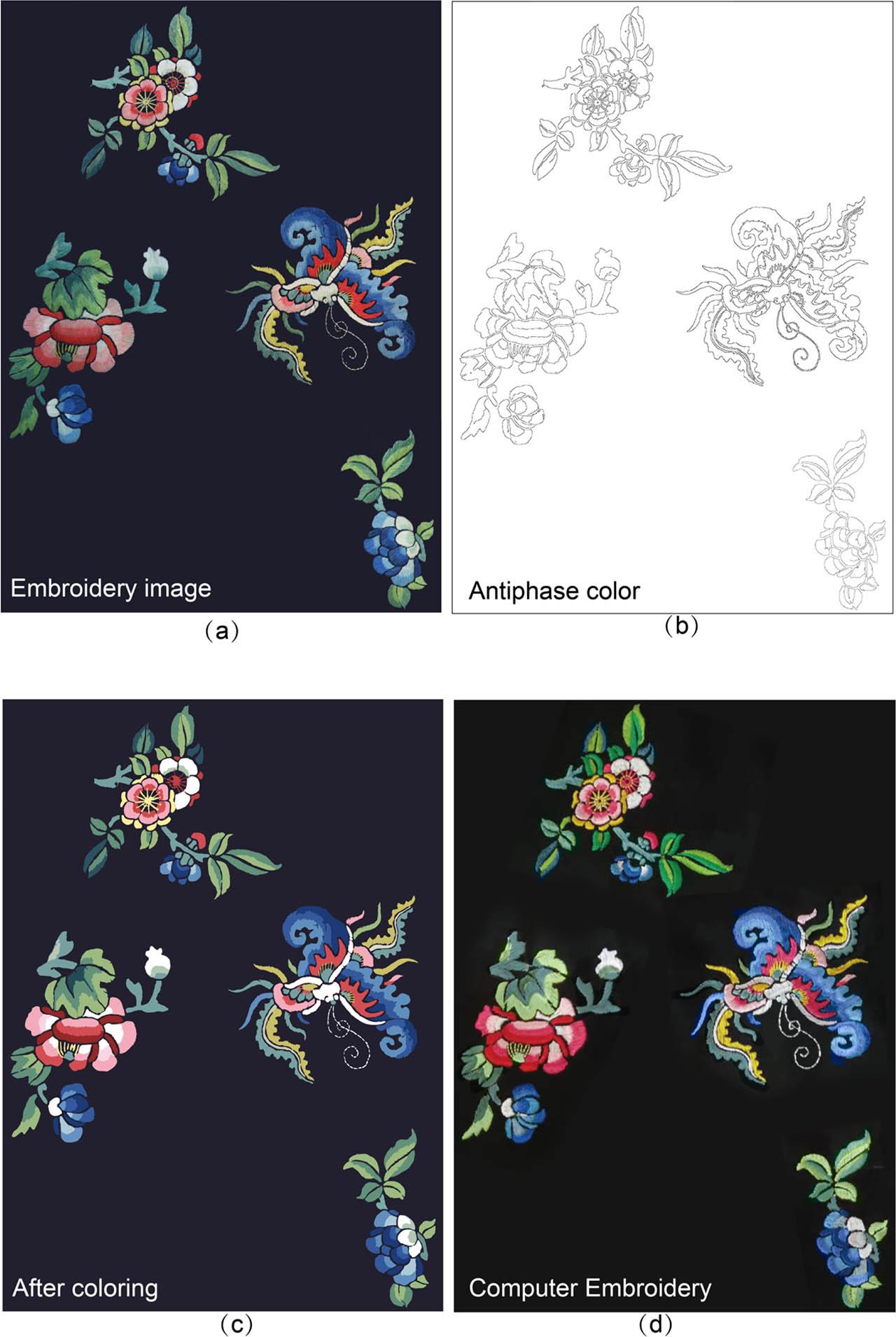 After colour recognition using image software, the result is a completely non-repeated colour parameter, although it is made of the same colour embroidered thread. Therefore, the difficulty is increased while designers are choosing and applying embroidery colours. Second, the embroidery contour is affected by the material and the needle method and is non-smooth. The graphic software cannot directly select the smooth contour for design innovation. It needs to be drawn manually, otherwise the details will be lost. Third, in addition to contours, the interior of embroidery patterns is usually made up of multiple different shapes. The joining between graphics is complex, as some are very close, some have certain spacing, and others are linked with regular points and lines. Therefore, designers need to spend much time on manually extracting pattern contours and graphic contours, and have a strong graphic software foundation.