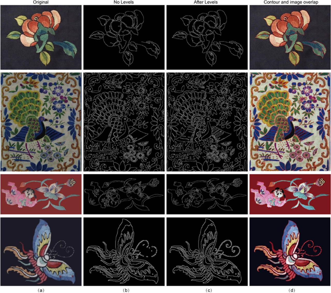 In the experiment, since some old objects and the dim pattern colours would affect the discrimination of the pattern contour, the step of colour level adjustment was added in the pretreatment. This is one of the innovations of the method proposed in this study. The effect was to overcome the colour concentration and increase the difference between colours. This treatment achieved visual beauty, and improved the calculation gradient in contour extraction.